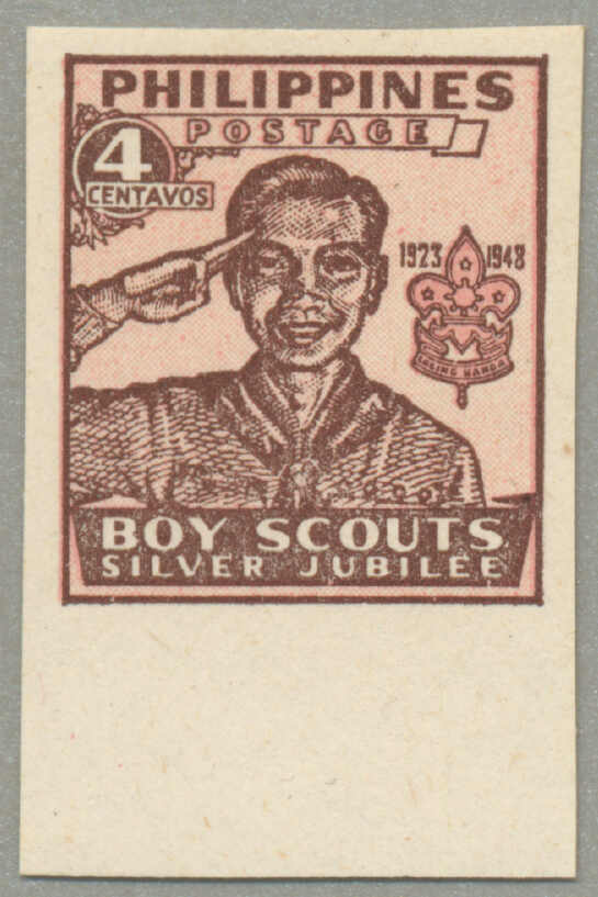 6510 nh image1946, imperforate 4c brown Boy Scouts SILVER JUBILEE stamp, issued version without perforation, large lower margin, original gum, clean and fresh example of this postwar Philippine commemorative in its imperforate state, VF! Estimate 100€. (Image) (imagea) (All Images)