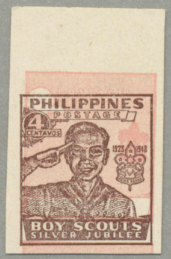 6509 (OG) image1946, imperforate colour trial in brown for the 4c Boy Scouts SILVER JUBILEE issue, printed on ungummed paper with large upper margin, strong printing error showing displaced colour plate resulting in significant misalignment of design and text, dramatic and scarce production variety from postwar Philippine scout issue, VF! Estimate 100€. (Image)
