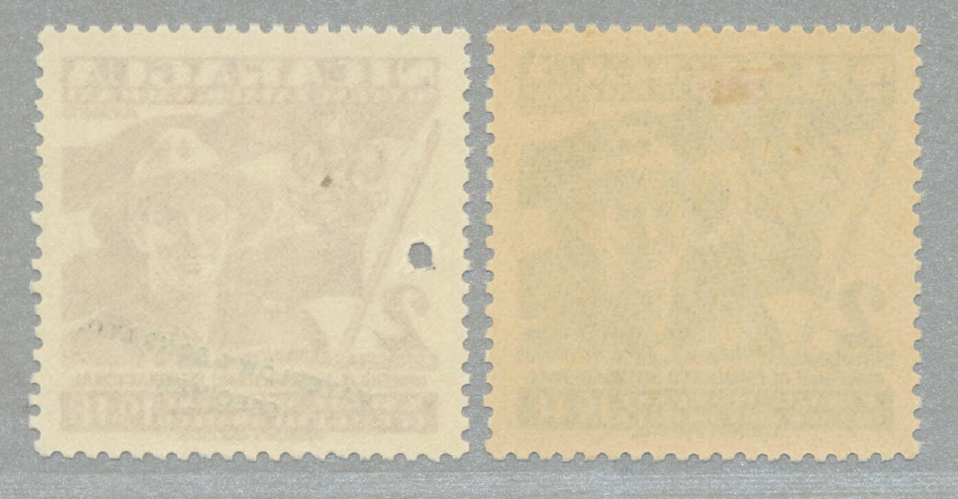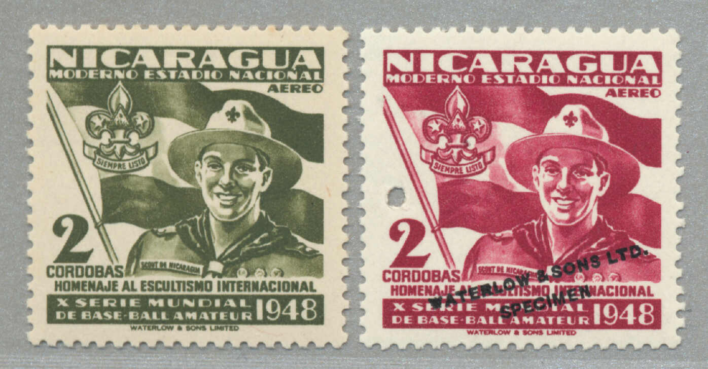 6512 nh image1948, set of (2) colour proofs for the 1948 Airmail Scout issue of Nicaragua, one with WATERLOW AND SONS SPECIMEN overprint and narrow perforation on the left, comprising 2c olive green and 2c carmine impressions showing design for the planned 6th World Jamboree, reverse with original gum and control punch on one stamp, scarce archival items from the unissued series prepared for a major international scout event that was later cancelled, VF! Estimate 120€. (Image) (imagea) (All Images)