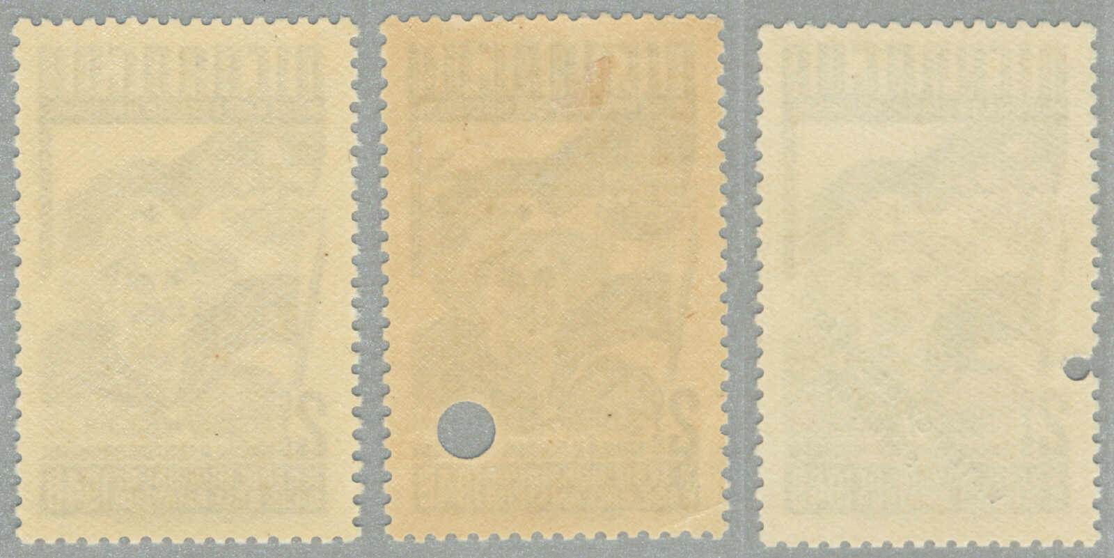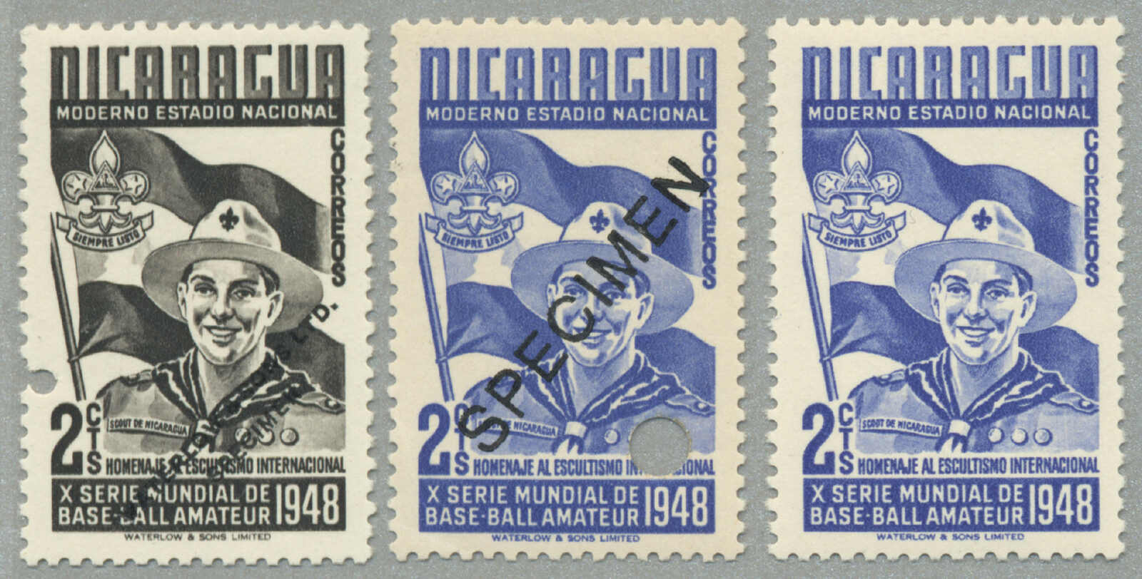 6513 nh image1948, set of (3) items related to the 1948 World Scout Jamboree issue of Nicaragua, including one issued 2s blue stamp with regular perforation, one SPECIMEN overprint example with large perforation and control punch, and one black colour proof with WATERLOW AND SONS SPECIMEN overprint and narrow perforation on the left, produced for the 10th Anniversary of Nicaraguan Scouting and in anticipation of the cancelled 6th World Jamboree, scarce group combining production stages and archival markings, VF! Estimate 160€. (Image) (imagea) (All Images)