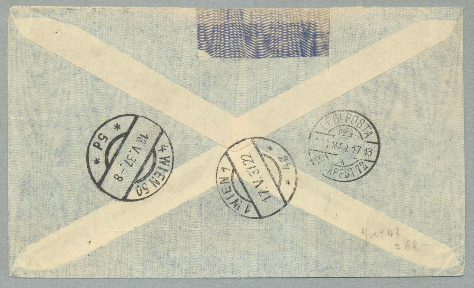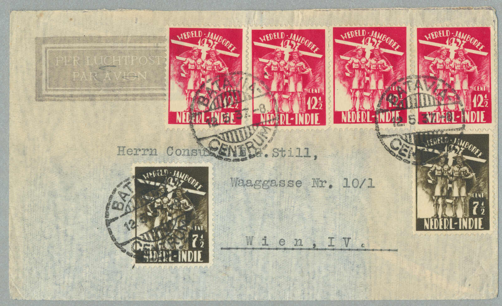 6516 on cover image1937, from Batavia to Vienna, airmail cover franked with (4) 12 1/2c red and (2) 7 1/2c black 1937 WORLD JAMBOREE stamps from Netherlands Indies, all with surtax (2 1/2c) in support of scout participation at the 1937 World Jamboree in the Netherlands, tied by BATAVIA CENTRUM 12.5.37 circular datestamps, reverse with transit postmarks BUDAPEST and arrival WIEN 18.VII.37, grey airmail envelope with PER LUCHTPOST cachet, clean and attractive cover reflecting Dutch colonial support of international scouting events, VF-XF! Estimate 300€. (Image) (imagea) (All Images)