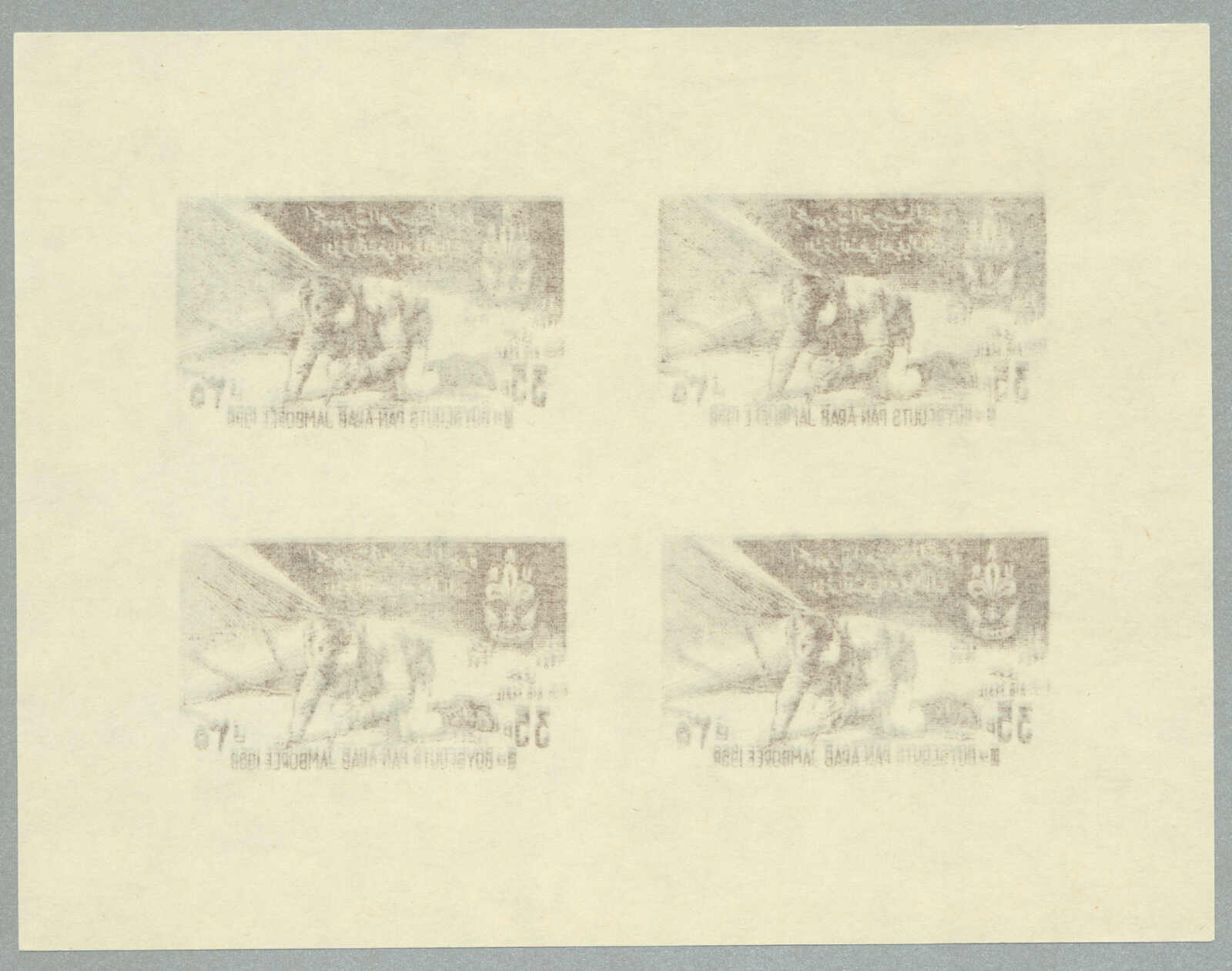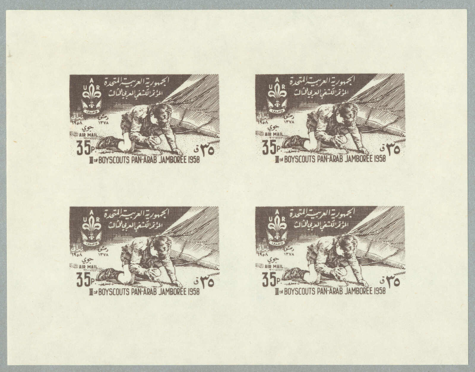 6520 nh image1958, unused imperforate block of (4), issued for the II PAN-ARAB JAMBOREE 1958 held in Tripoli, brown 35 p air mail stamp showing Arab scout kneeling beside tent, Arabic and English inscriptions, emblem of the Arab Scout Organization at upper left, a rare and striking multiple from a scarce Scout thematic issue, XF! Estimate 600€. (Image) (imagea) (All Images)