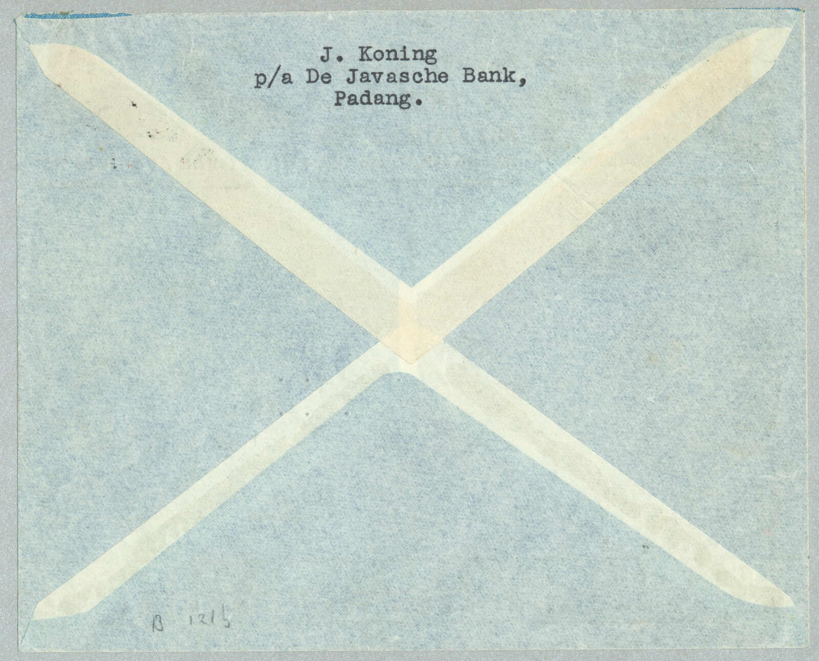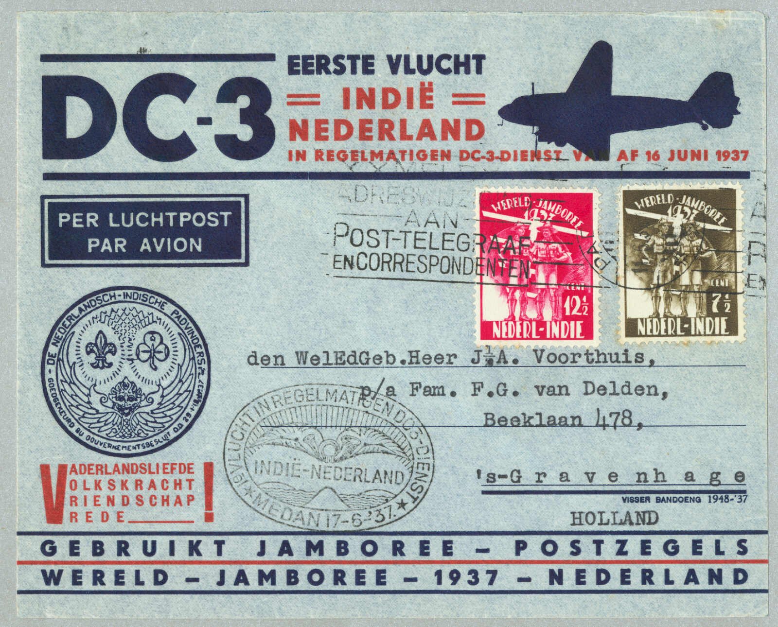 6514 on cover image1937, from Padang to The Hague, printed scout souvenir envelope for the first DC-3 flight from Dutch East Indies to the Netherlands, franked with (2) 1937 NEDERL-INDIE Wereld-Jamboree scout stamps 12 1/2c red and 7 1/2c black, special printed design featuring DC-3 silhouette and large bilingual PER LUCHTPOST cachet, additional boxed ENCORRESPONDENTIE POST-TELEGRAAF marking, sent by a scout affiliated with De Javasche Bank, historical postal item related to scout fundraising and air mail service from Sumatra to the 1937 World Scout Jamboree, very fresh and appealing, XF! Estimate 300€. (Image) (imagea) (All Images)