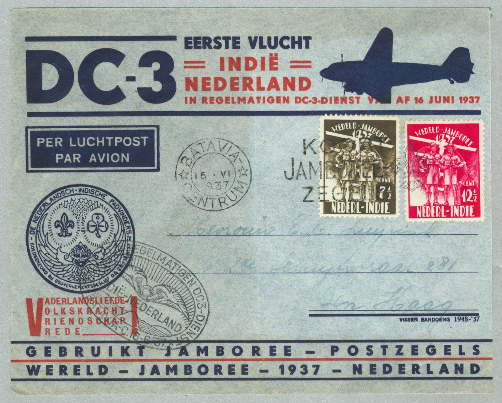 6515 on cover image1937, from Batavia to Zegveld, printed scout souvenir envelope commemorating the first DC-3 flight from Dutch East Indies to the Netherlands, franked with (2) 1937 NEDERL-INDIE red and black Wereld-Jamboree scout stamps 12 1/2c and 7 1/2c, both tied by BATAVIA CENTRUM 15.VI.37 cancel, special cachet with DC-3 silhouette and bilingual PER LUCHTPOST marking, sent by a scout from Victoria Hotel Soekaboemi, historically significant postal document related to the 1937 World Scout Jamboree in the Netherlands, very fresh and striking, XF! Estimate 300€. (Image) (imagea) (All Images)