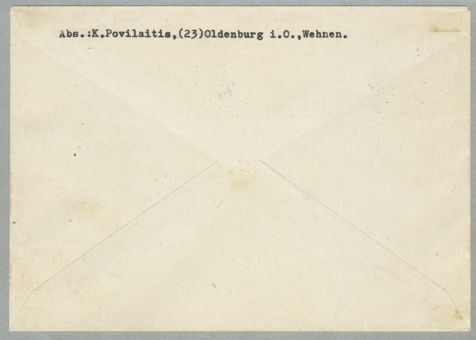 6525 on cover image1949, from Oldenburg to Hannover, Displaced Persons Camp cover sent by Lithuanian scout from DP Camp Wehnen, franked with (3) private Lithuanian scout stamps and one German Berlin red definitive, all tied by GERMAN OLDENBURG 23.3.49 and LITHUANIAN PASTAS WEHNEN D.P. CAMP datestamps, sender noted as A. Povilaite (230) Oldenburg i. O. Wehnen, historically significant mixed franking showing use of Lithuanian private mail in combination with German postal system within postwar DP infrastructure, very fresh and desirable, XF! Estimate 200€. (Image) (imagea) (All Images)