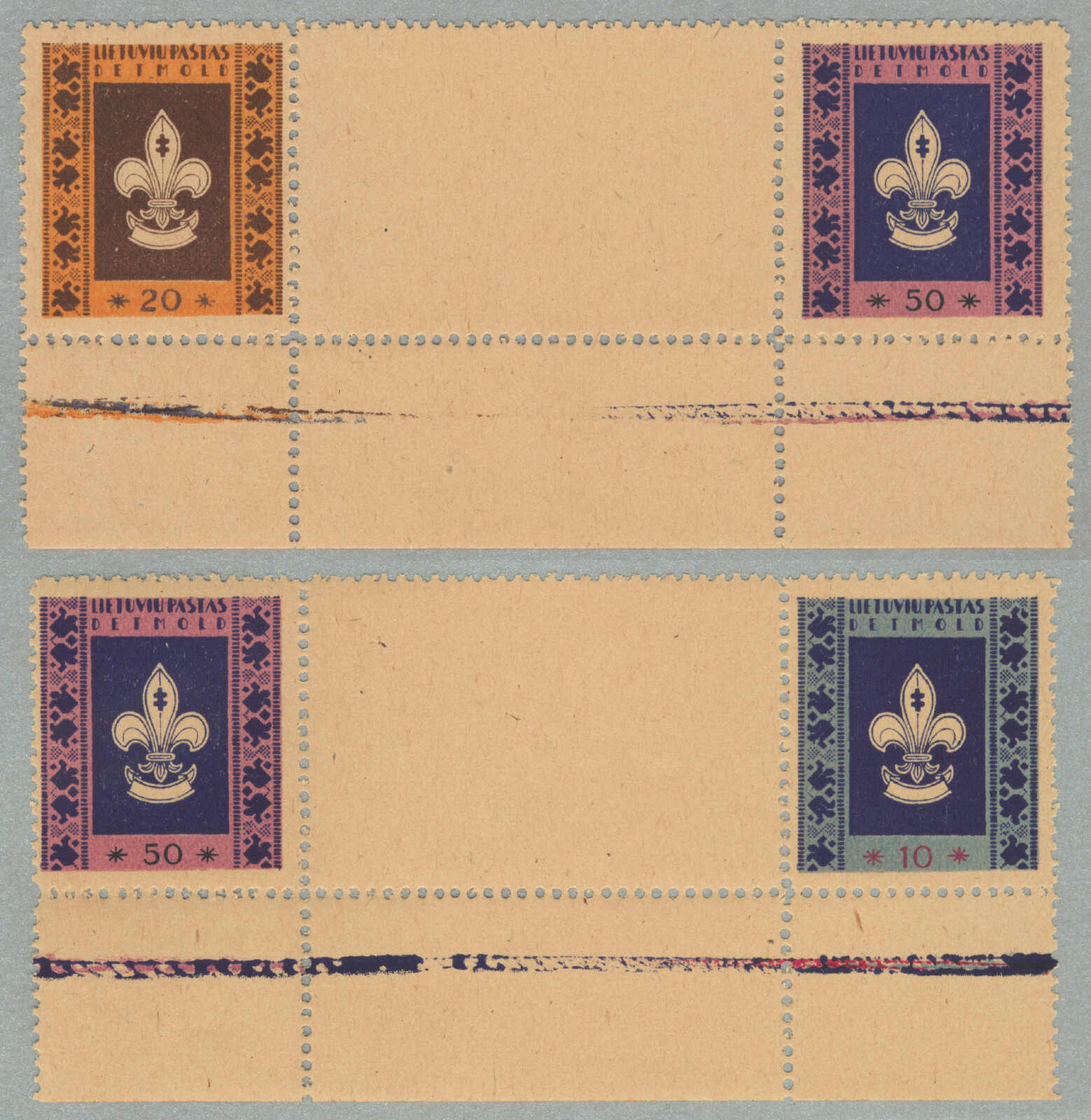 6526 nh image1946, local DP camp stamps from Detmold (4), values 10, 20 and (2) 50 cts, all showing large scout lily emblem in ornate frames, printed for internal mail under UNRRA administration, including (2) corner margin pairs with full perforation and partial printing lines in selvage, issued by Lithuanian exiles after WWII, scouts helped with distribution as part of their educational service, historical postwar refugee issue, XF! Estimate 500€. (Image) (imagea) (All Images)