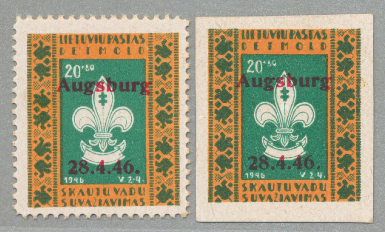 6527 nh image1946, local DP camp stamps (2) issued for the Lithuanian Scout Leaders Meeting in Augsburg on 28.4.1946, both based on DETMOLD issue with central lily emblem and ornate yellow-green border, one perforated and one imperforate, each overprinted AUGSBURG 28.4.46 in red, commemorative issue by Lithuanian exiles in Germany after World War II, rarely seen both types together, fresh and desirable, XF! Estimate 300€. (Image) (imagea) (All Images)