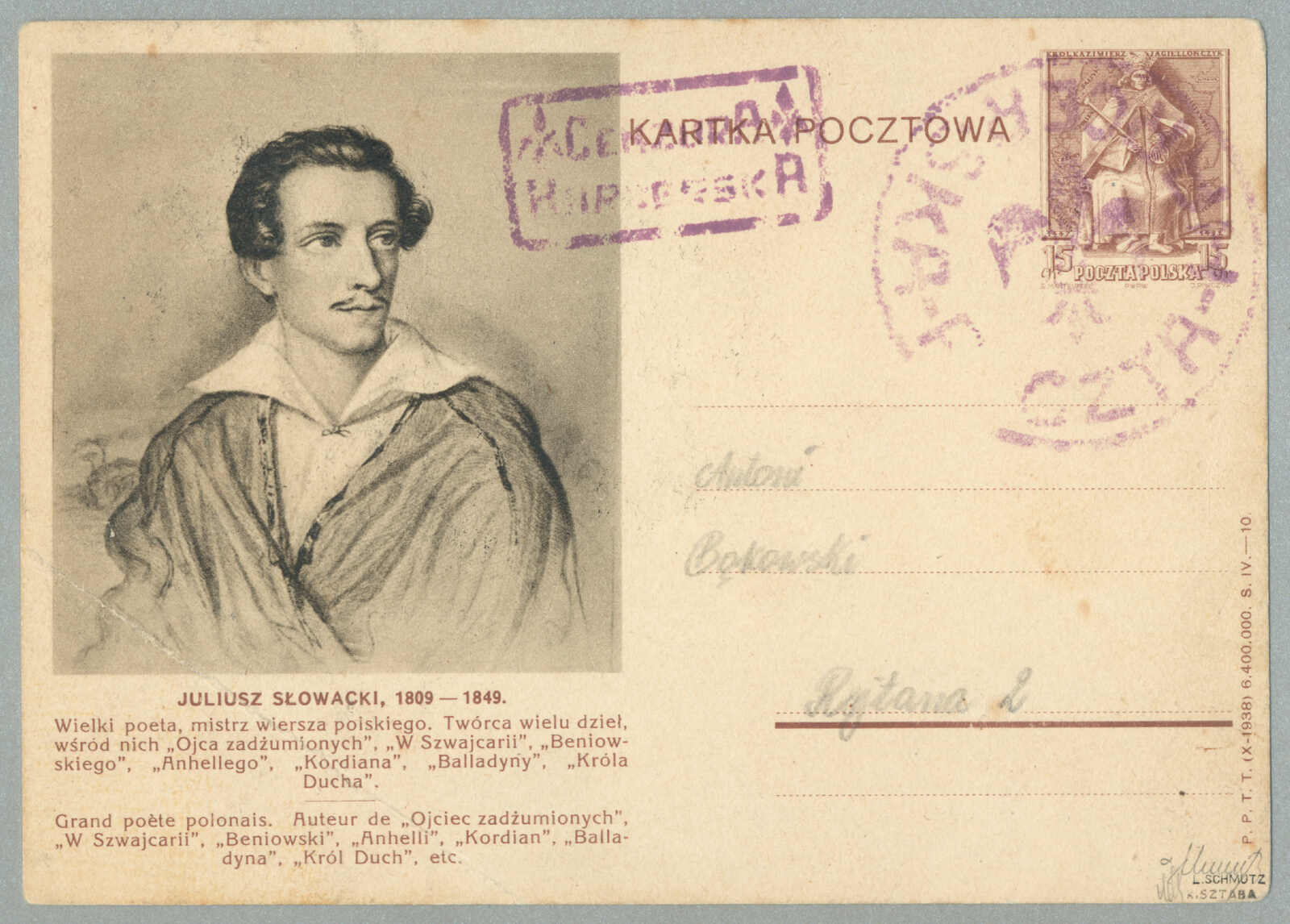 6504 on cover image1944, illustrated patriotic postcard with portrait of Juliusz Slowacki and literary references in Polish and French, franked with 15 gr Polish staionary imprint depicting the Swordsman (Zolnierz), tied by violet boxed HARCEERSKA and circular datestamp, handwritten message on reverse referencing a scout unit and sender named Roman, issued during final months of German occupation in southeastern Poland, rare scout field post usage in late wartime setting, VF! Estimate 900€. (Image) (imagea) (All Images)