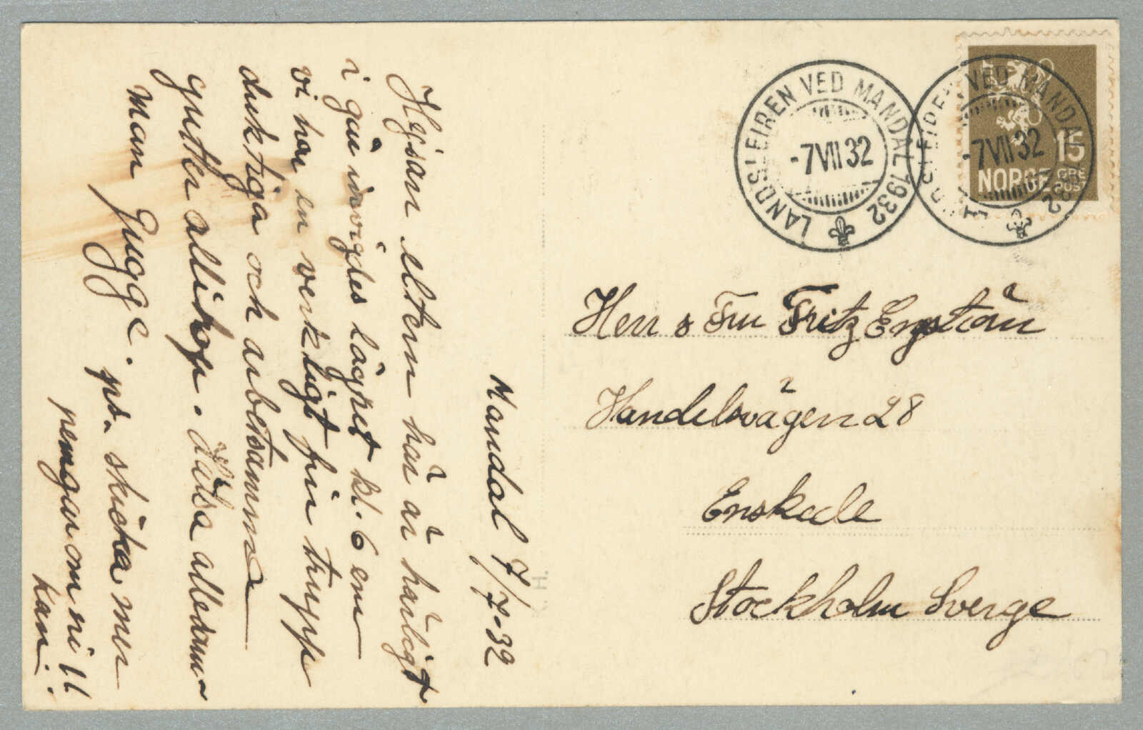 6545 on cover image1932, from Mandal to Enskede, Sweden, picture postcard showing a Scout leader in full uniform, franked with 15 øre brown Lion definitive, tied by special cancel LANDSTURNLEIREN VED MANDAL 1932 7.VII.32 with fleur-de-lis symbol, full message in Swedish referencing daily life at camp, sent during the 1932 Norwegian National Scout Jamboree near Mandal, scarce usage with Scout camp postmark and period photo of Scout official, fresh and desirable, VF! Estimate 200€. (Image) (imagea) (All Images)