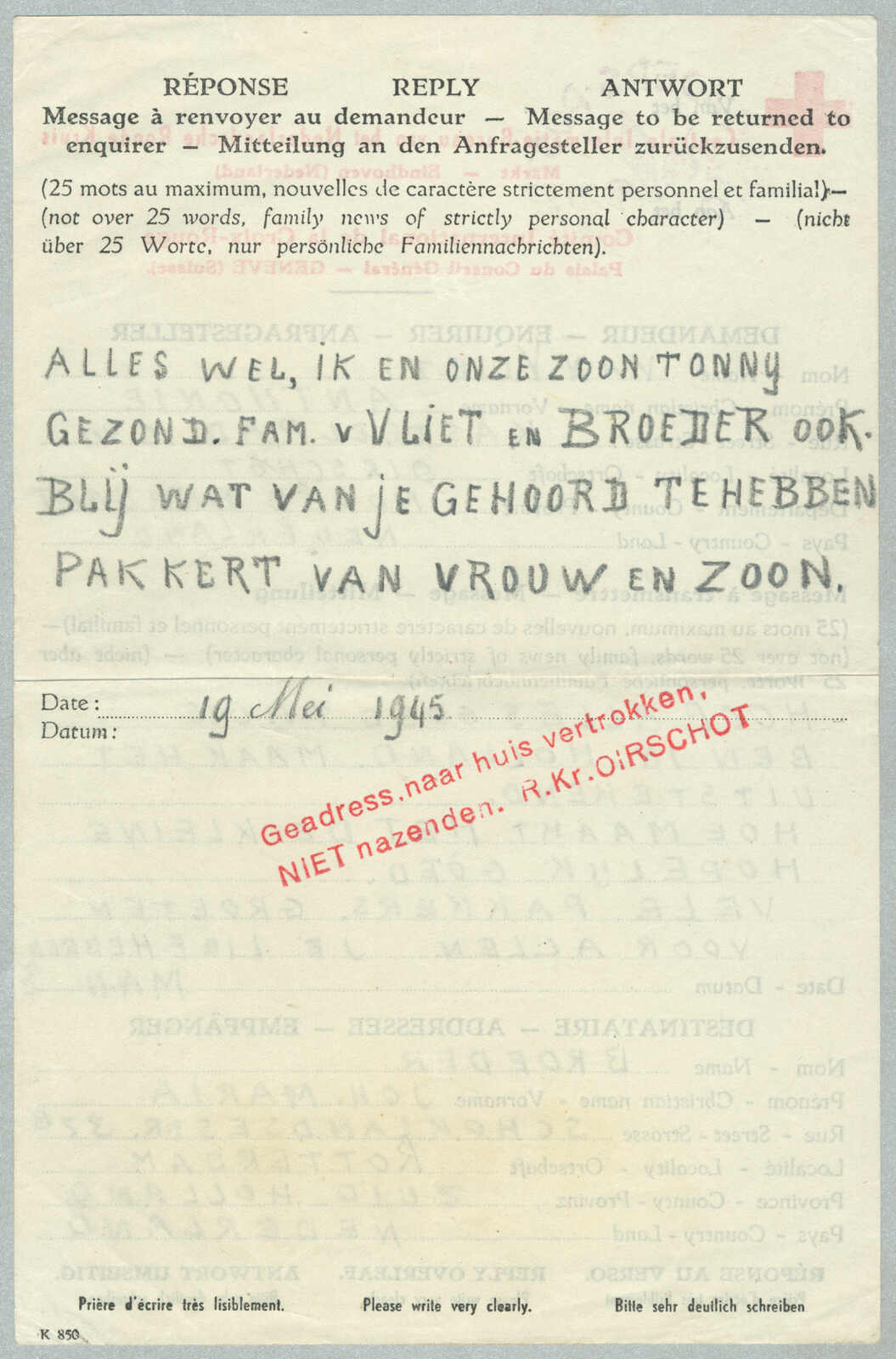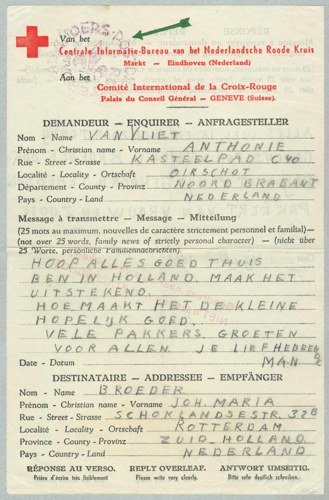 6550 on cover image1945, Red Cross message form used between Oirschot and Rotterdam, filled both sides with enquiry and reply, dated 19 May 1945, printed trilingual form COMITE INTERNATIONAL DE LA CROIX ROUGE GENEVE with Dutch Red Cross branch EINDHOVEN, transported across former German and Allied zones shortly after WWII, bearing red boxed handstamp GEADDRESS NAAR HUIS VERTROKKEN NIET NAZENDEN R.Kr. OIRSCHOT on reverse, delivered locally in Rotterdam by Boy Scout messenger unit as postal services were re-established, rare civilian communication under transitional administration with Scout involvement, XF! Estimate 400€. (Image) (imagea) (All Images)
