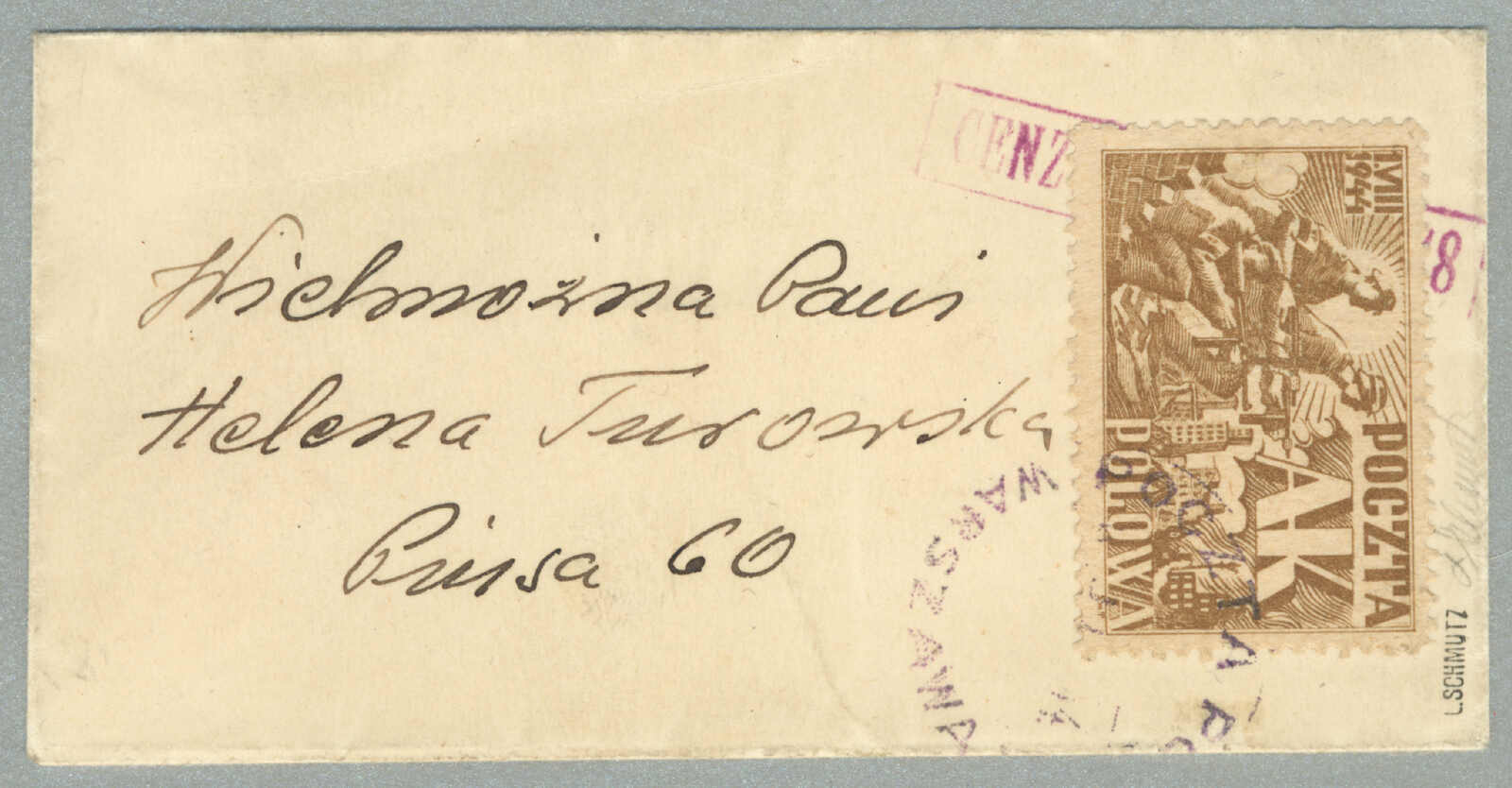 6505 on cover image1944, Scout mail envelope carried during the Warsaw Uprising, franked with brown 1Z AK fieldpost stamp showing Polish insurgents, tied by POCZTA POLOWA WARSZAWA circular postmark type 19a, struck with violet boxed censor mark CENZUROWANE No. 18 introduced from 2 September 1944, addressed to Helena Tuszynska in Biała 60, sender noted on reverse, issued during the August 1944 uprising against German occupation, with scouts and guides organizing underground delivery routes through bombed Warsaw, rare and iconic resistance postal history item, XF! Schätzpreis 900€. (Image) (imagea) (All Images)