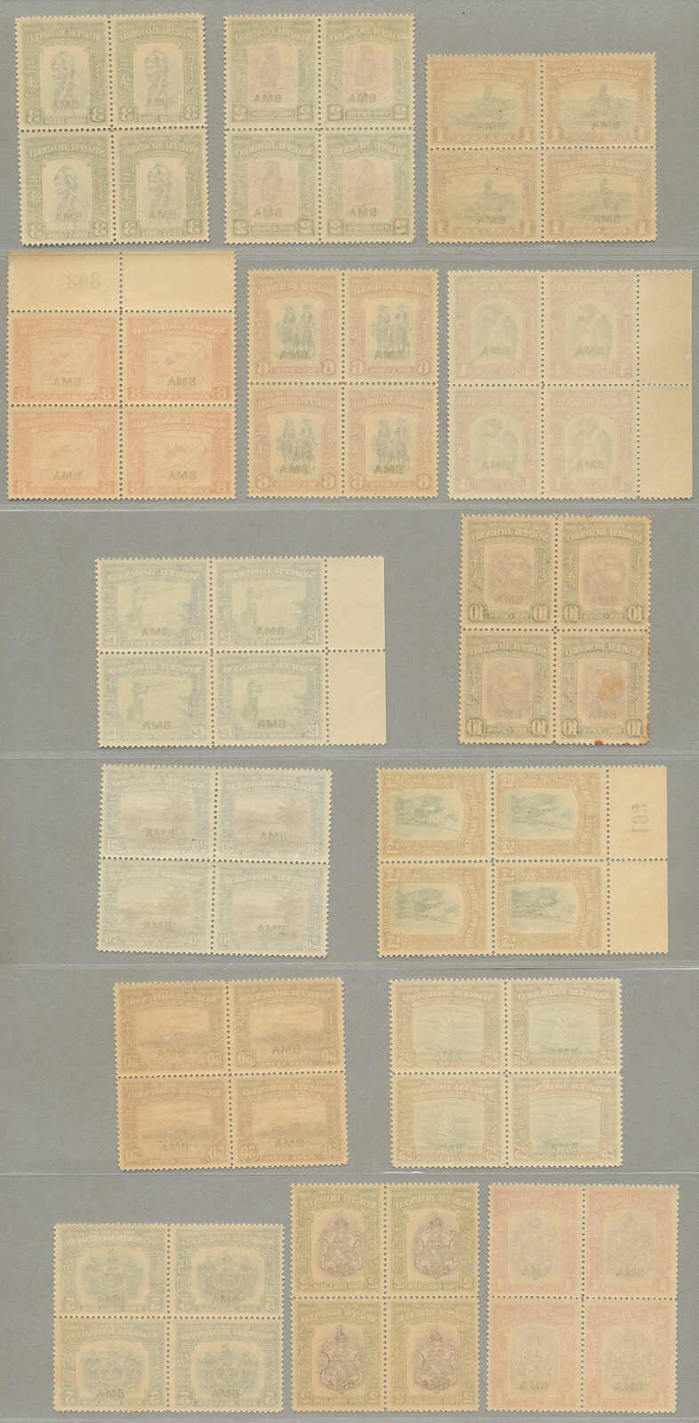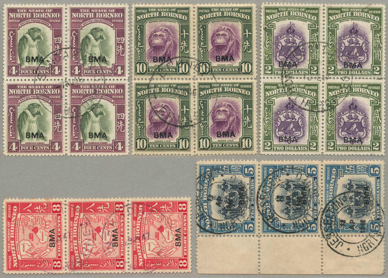 1945, nice lot of used units, 4c, 8c, 10c, $2, $5, (3) blocks of (4) and (2) strips of (3) - one with margin, nice cancels, CV £400+, a great lot, VF-XF! Estimate 480€.