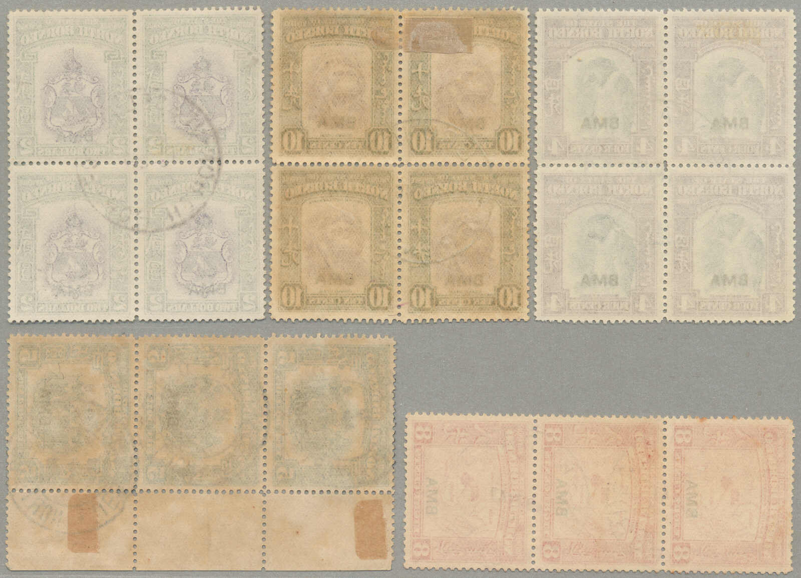 Automatisch generierte Übersetzung: 1945, schönes Lot von gebraucht Einheiten, 4c, 8c, 10c, $2, $5, (3) Viererblocks und (2) Dreierstreifen - ein mit Rand, schön Entwertungen, Katalogwert £400 +, ein großartiges Lot, VF-XF! Schätzpreis 480. (SG 323, 325, 326, 333, 334) (Image) (imagea)