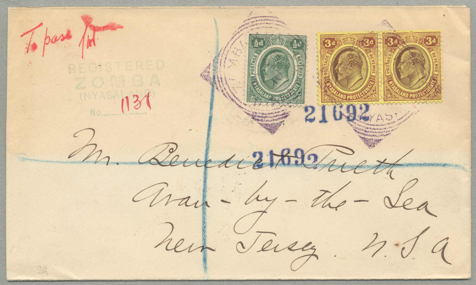 (3) (ein Paar, ein Seitenrandstück) + 6d + 1s, Mischfrankatur von Britisch Zentralafrika Protektorat und Nyasaland Protektoratsmarken auf Einschreibebrief aus ZOMBA nach Charlottenburg, Deutschland, gestempelt mit fünf blau ZAMBA M. O. B, NYASALAND,
