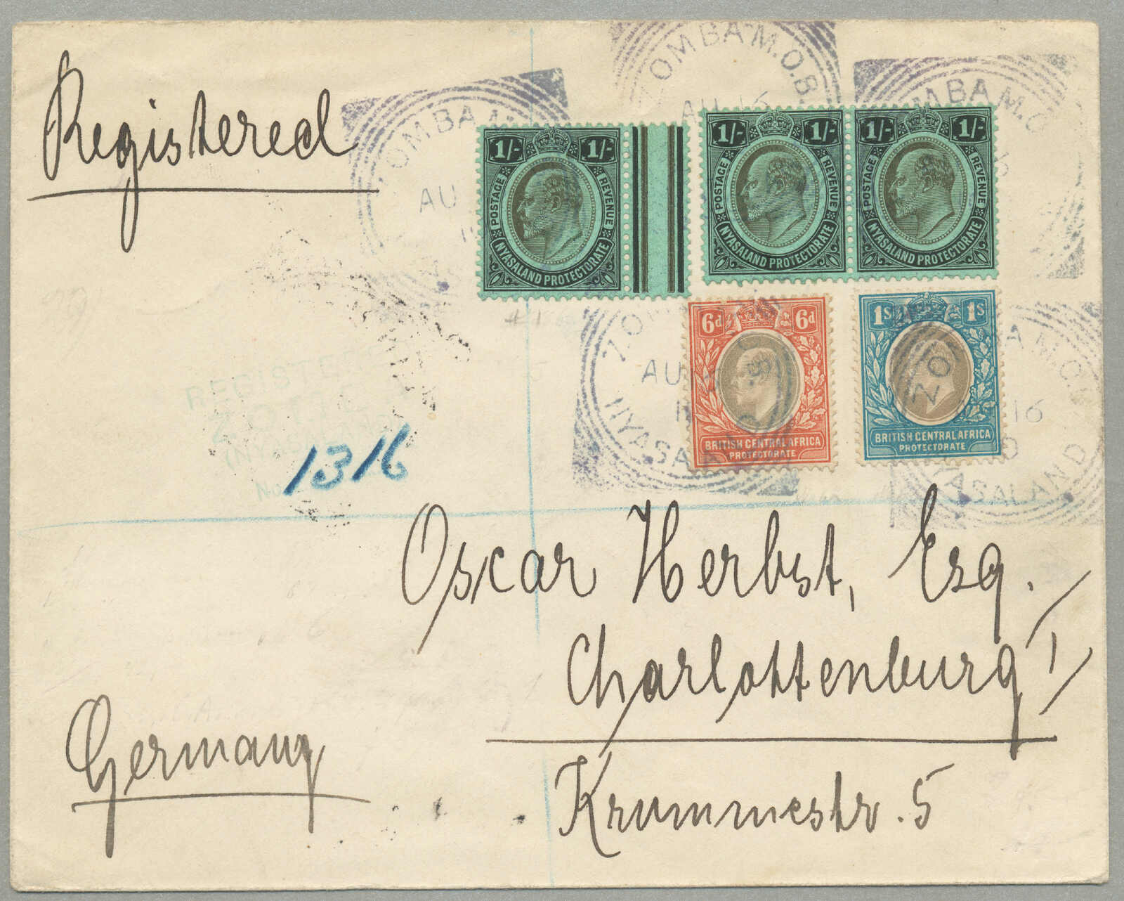1903-11, 1s(3) (one pair, one margin piece)+6d+1s, mixed franking of British Central Africa Protectorate and Nyasaland Protectorate stamps on registered letter from ZOMBA to CHARLOTTENBURG, Germany, struck by five blue