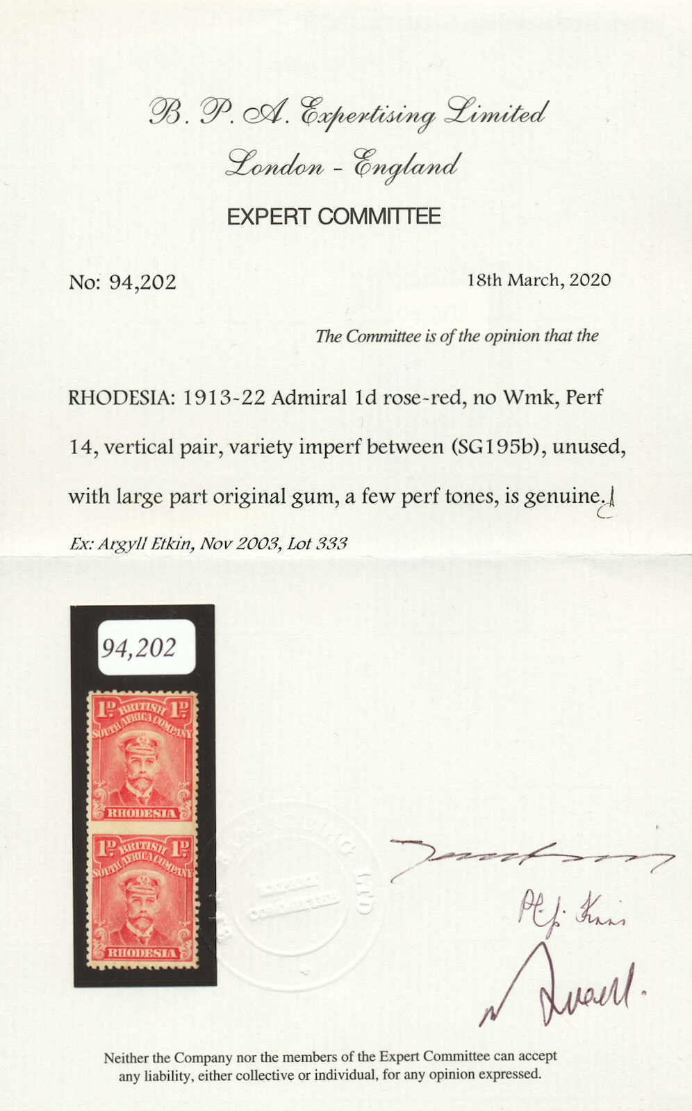 1913-22, 1 d. rose-red, perf. 14, vertical pair, IMPERFORATE between, LPOG, one or two minor age spots, Cert. BPA (2020), CV £3000, Provenance: Argyll Etkin, London, 4 Nov 2003, lot 333, very rare stamp, VF-XF! Estimate