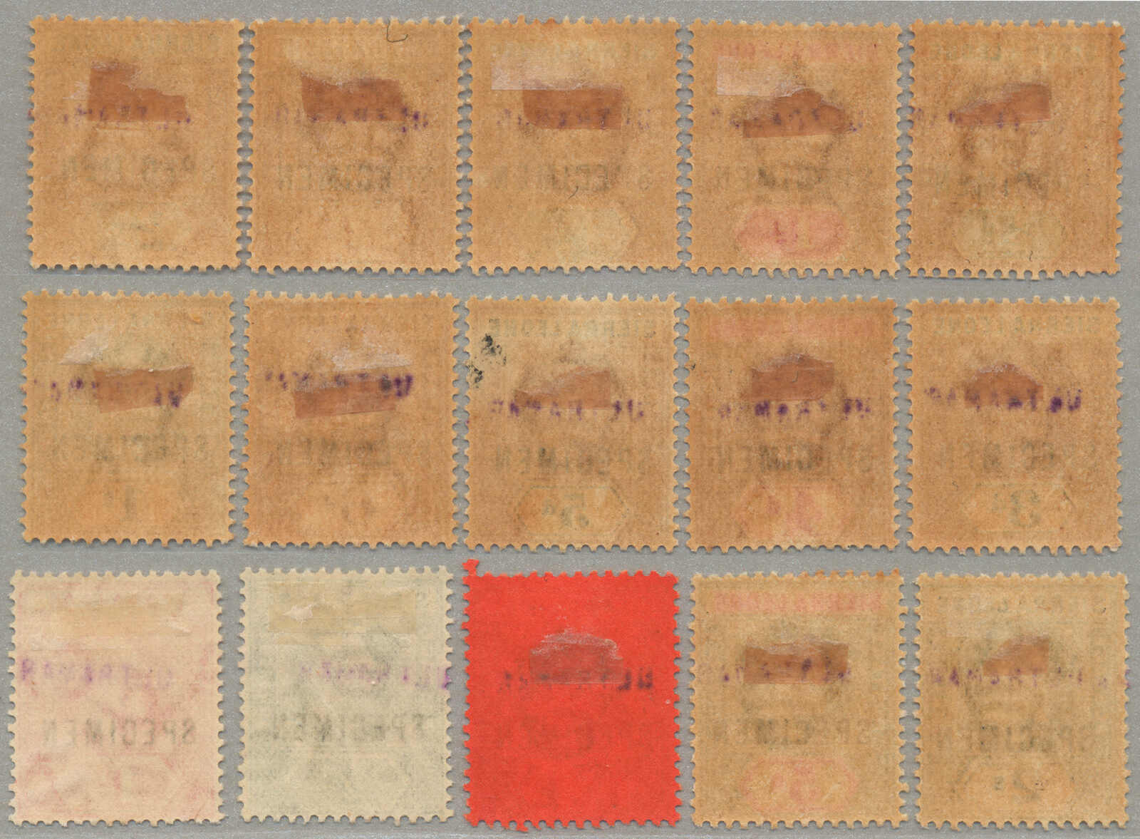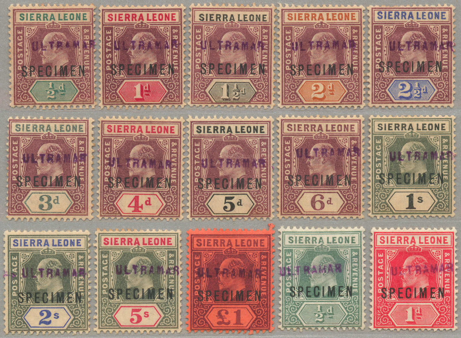 1903-12, 1/2d. - £1, full set from 1903 and two stamps of the 1907-12 issue, all opt black SPECIMEN and violet handstamped ULTRAMAR, wmk CCA, LPOG, slightly toned,still desirable, VF! Estimate 300€.