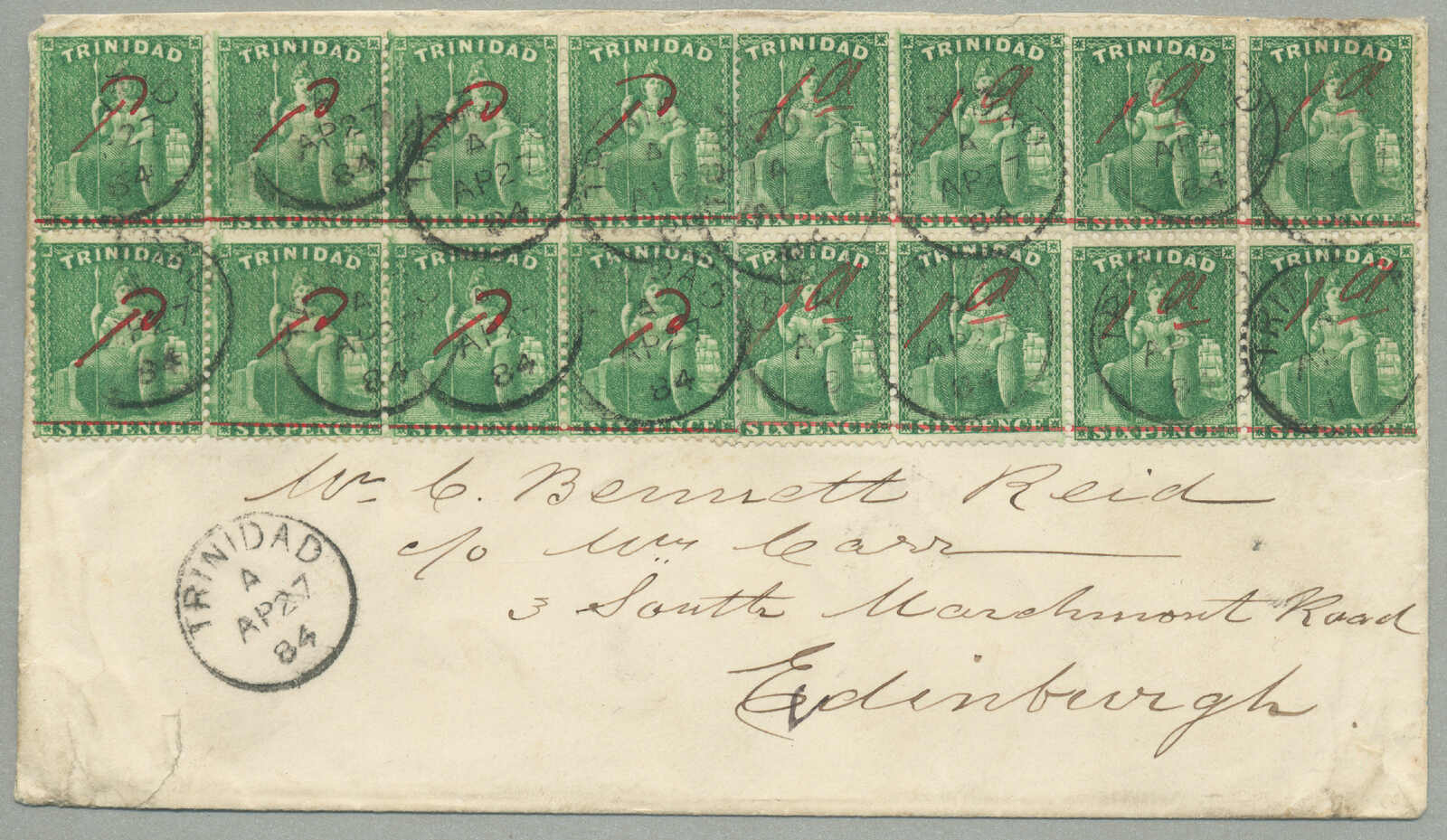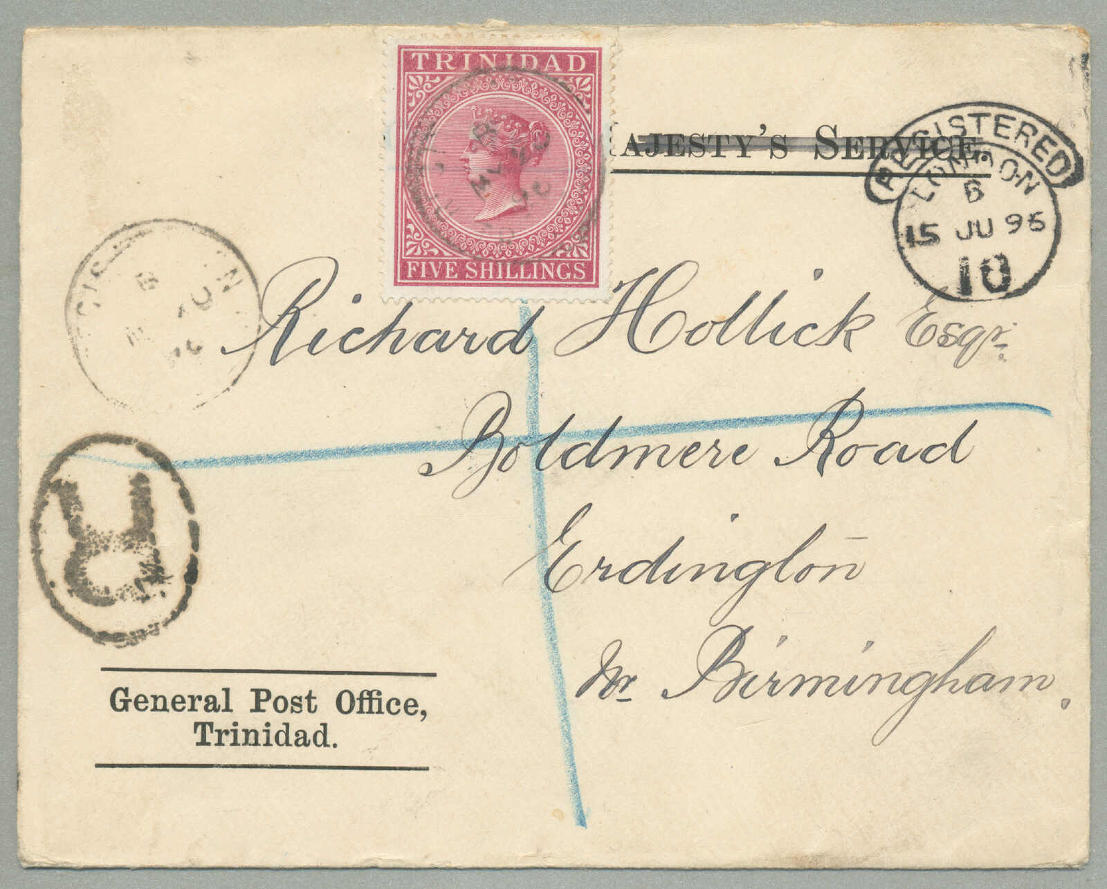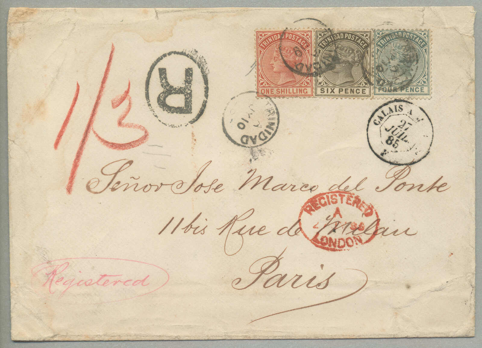 1885, 1s, red, 6d, brown and 4d, blue on cover to Paris, canceled TRINIDAD / A / JY10, Registered postmark, script Registered in magenta, red oval stamp REGISTERED / A / 27 JY 85 / LONDON, black transfer CALAIS / 27 / JUIL