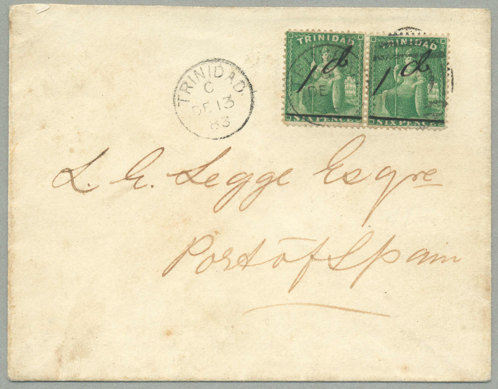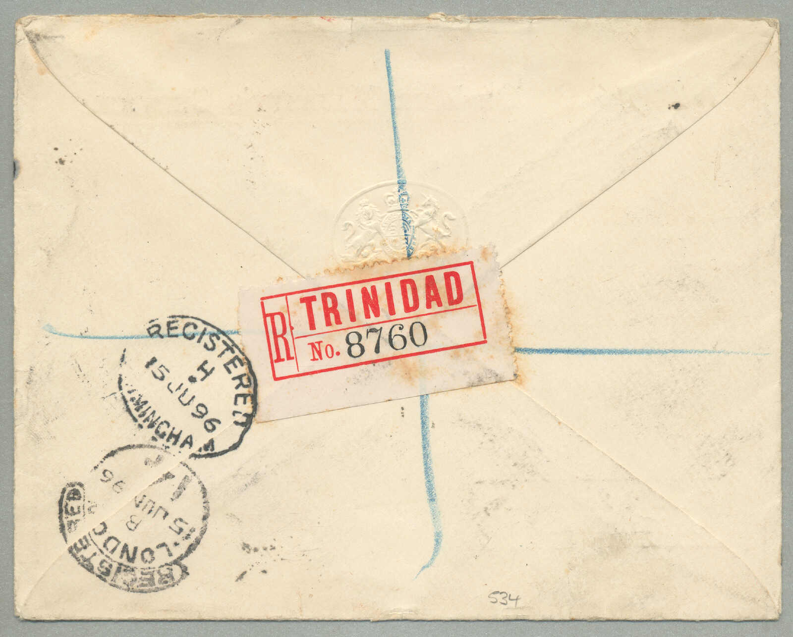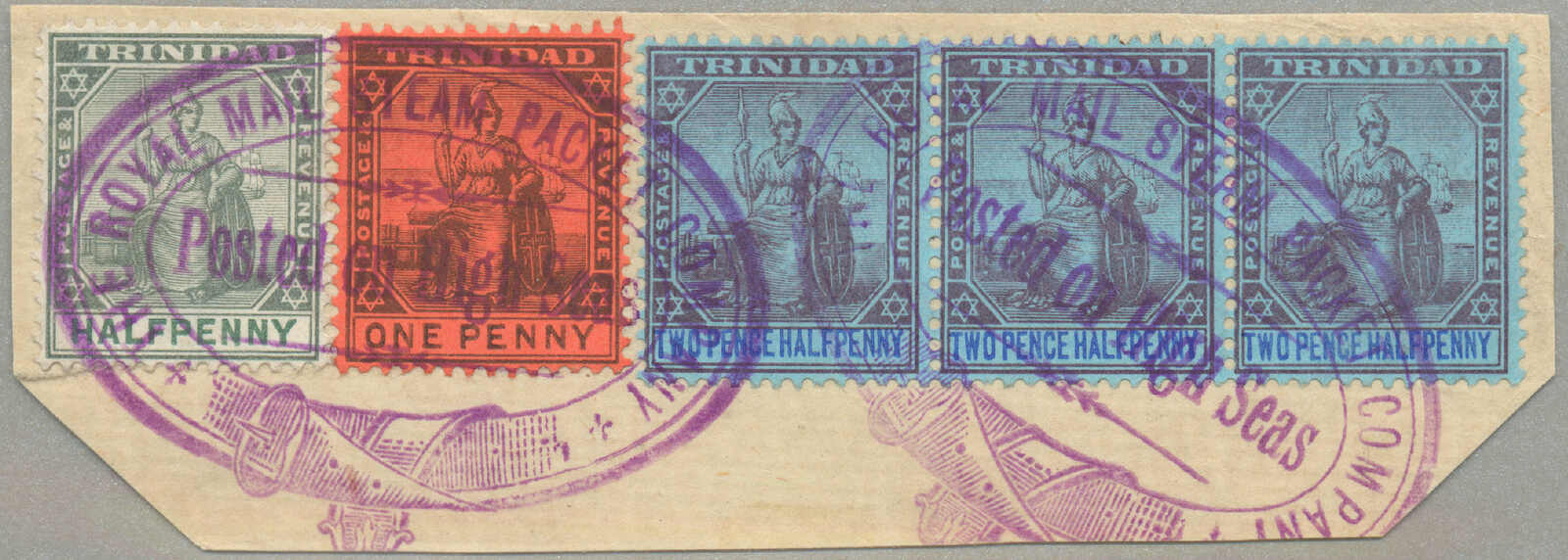1885, 1s, red, 6d, brown and 4d, blue on cover to Paris, canceled TRINIDAD / A / JY10, Registered postmark, script Registered in magenta, red oval stamp REGISTERED / A / 27 JY 85 / LONDON, black transfer CALAIS / 27 / JUIL