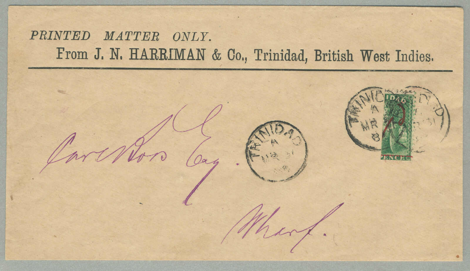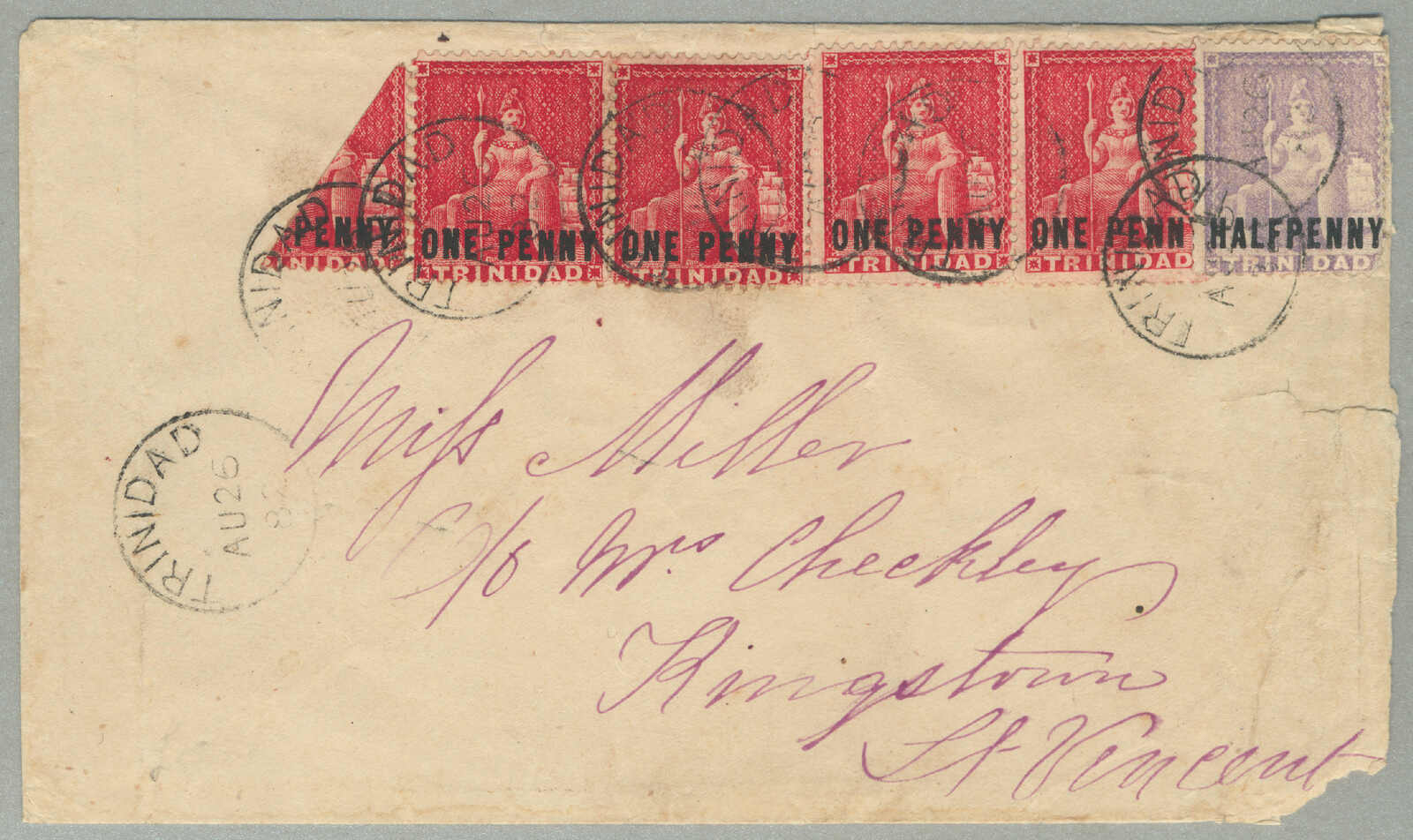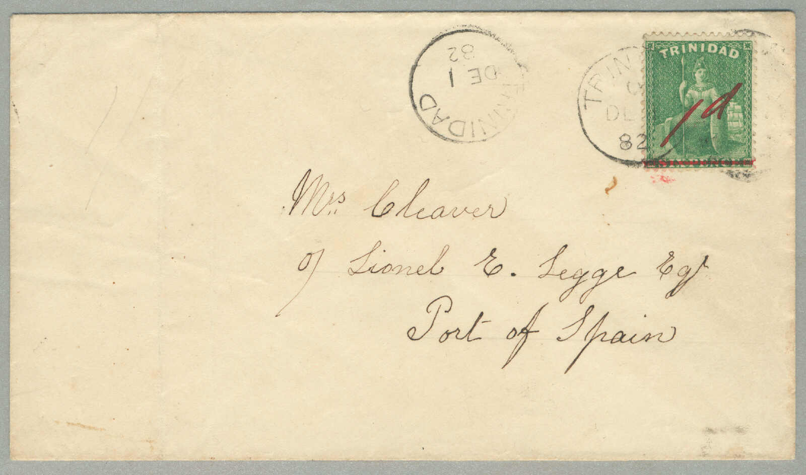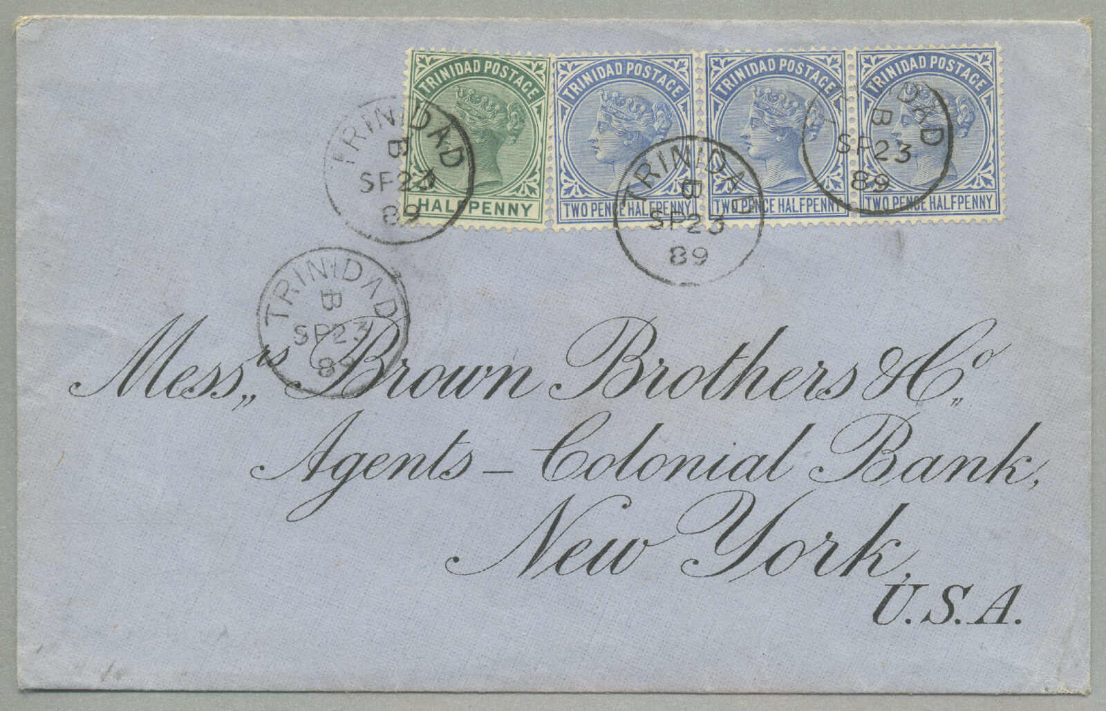 Automatisch generierte Übersetzung: 1885,1s, rot, 6d, braun und 4d, blau auf Brief nach Paris, gestempelt TRINIDAD / A / JY10, Einschreibstempel,