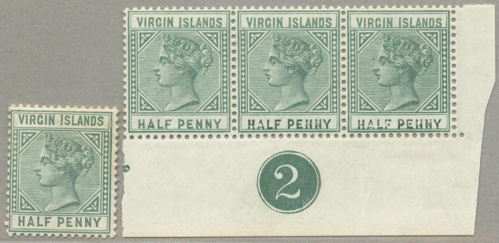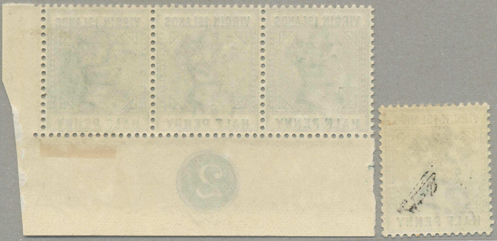 1883, 1/2d., dull green, strip of 3, and single stamp for comparison, strip with badly printed and offset value in tablet, touching the frame on lower side, plate number 2 in margin, perf 14, LPOG, fresh and desirable, XF!