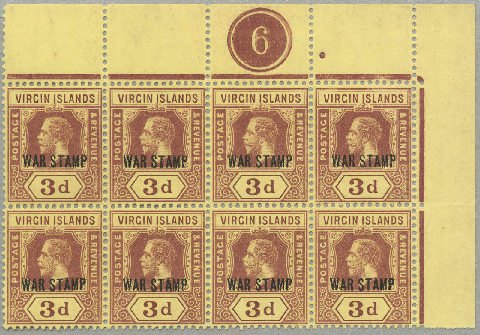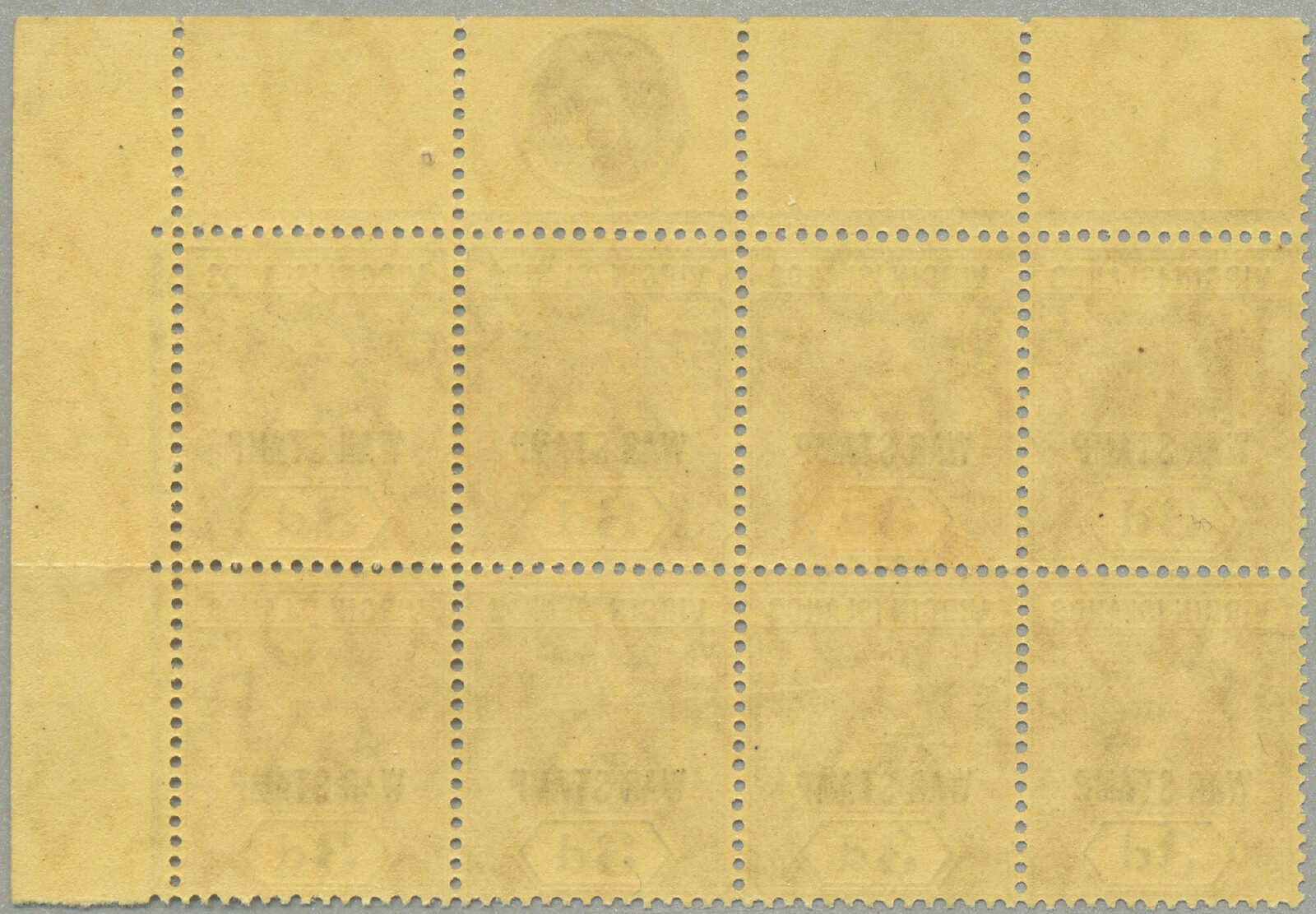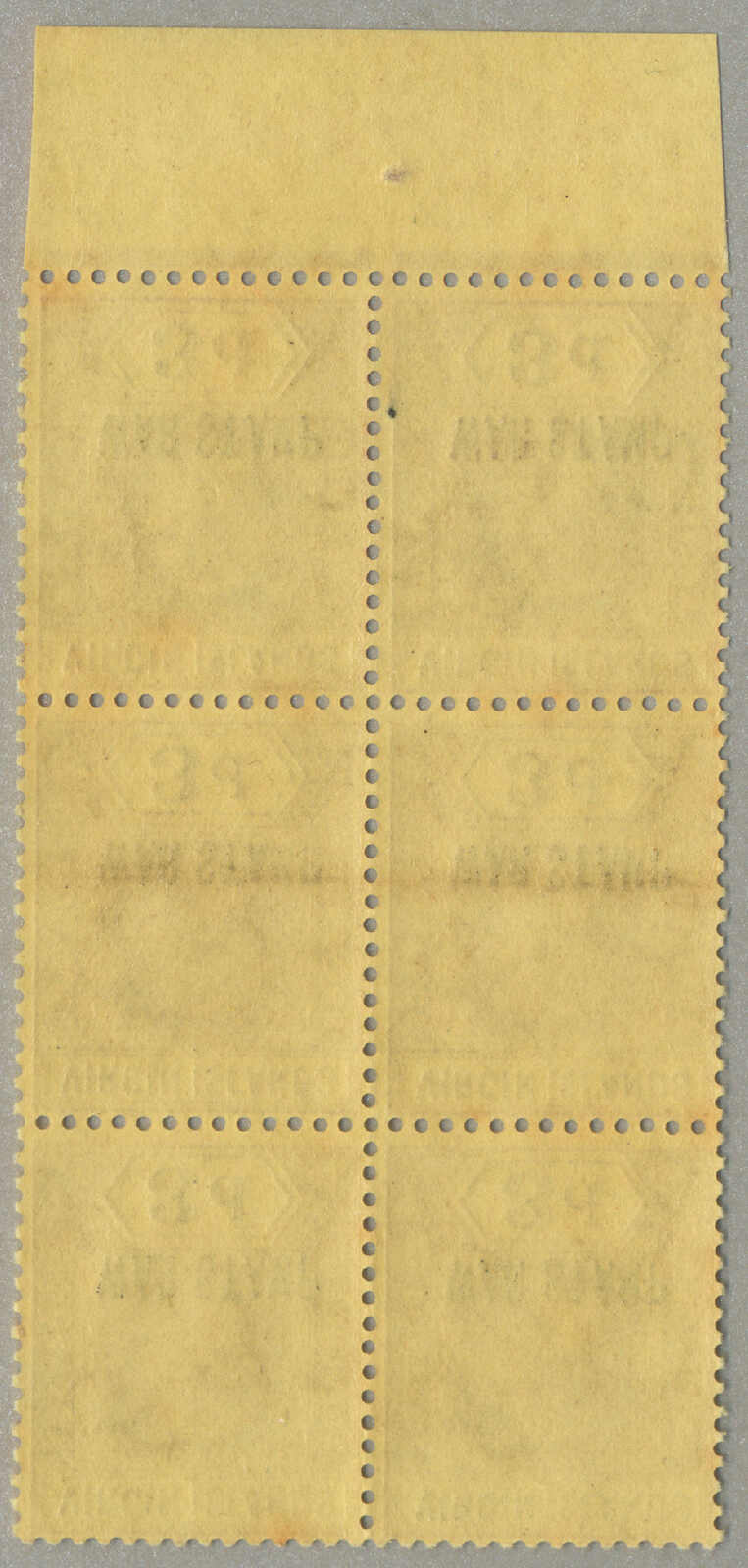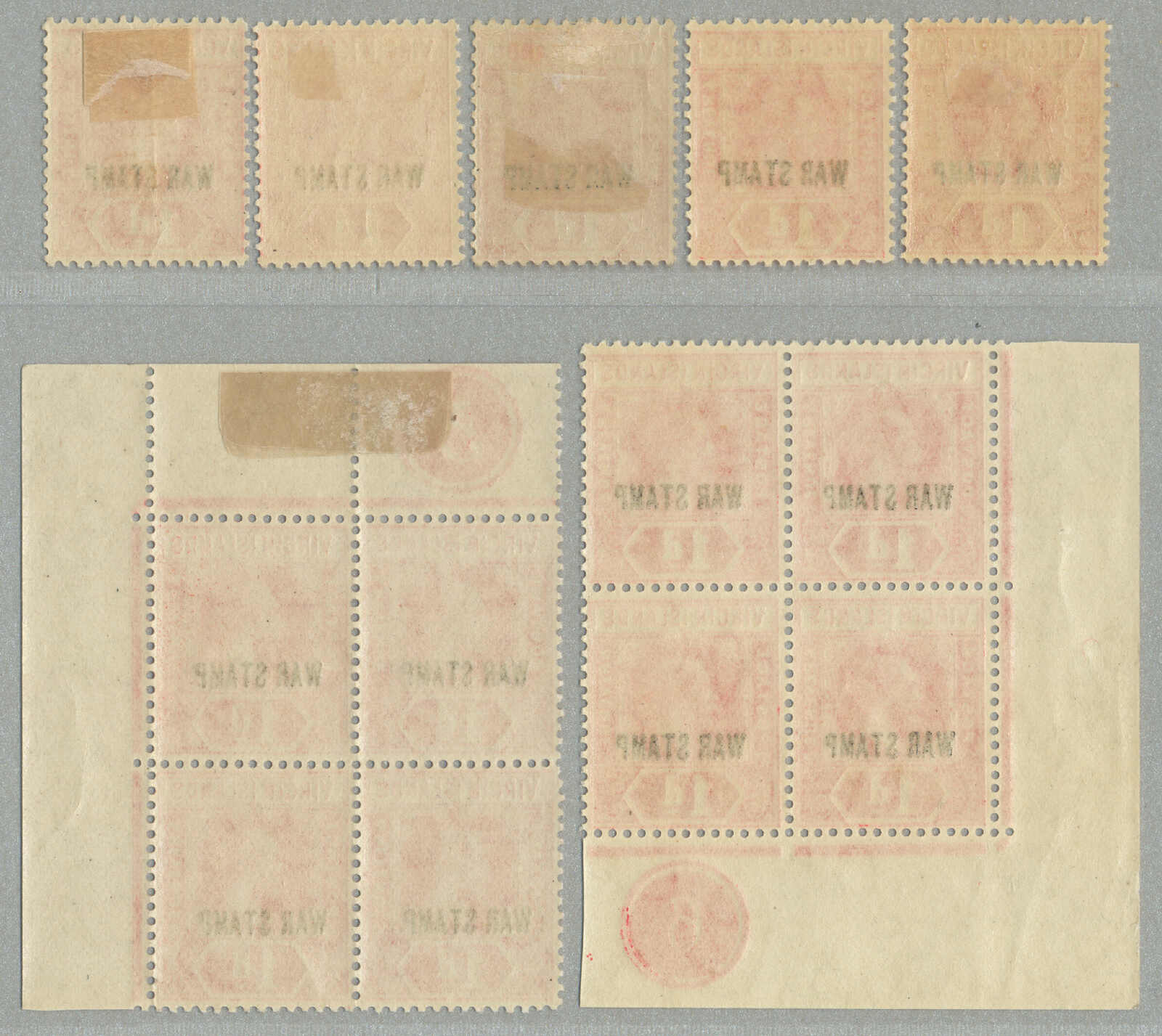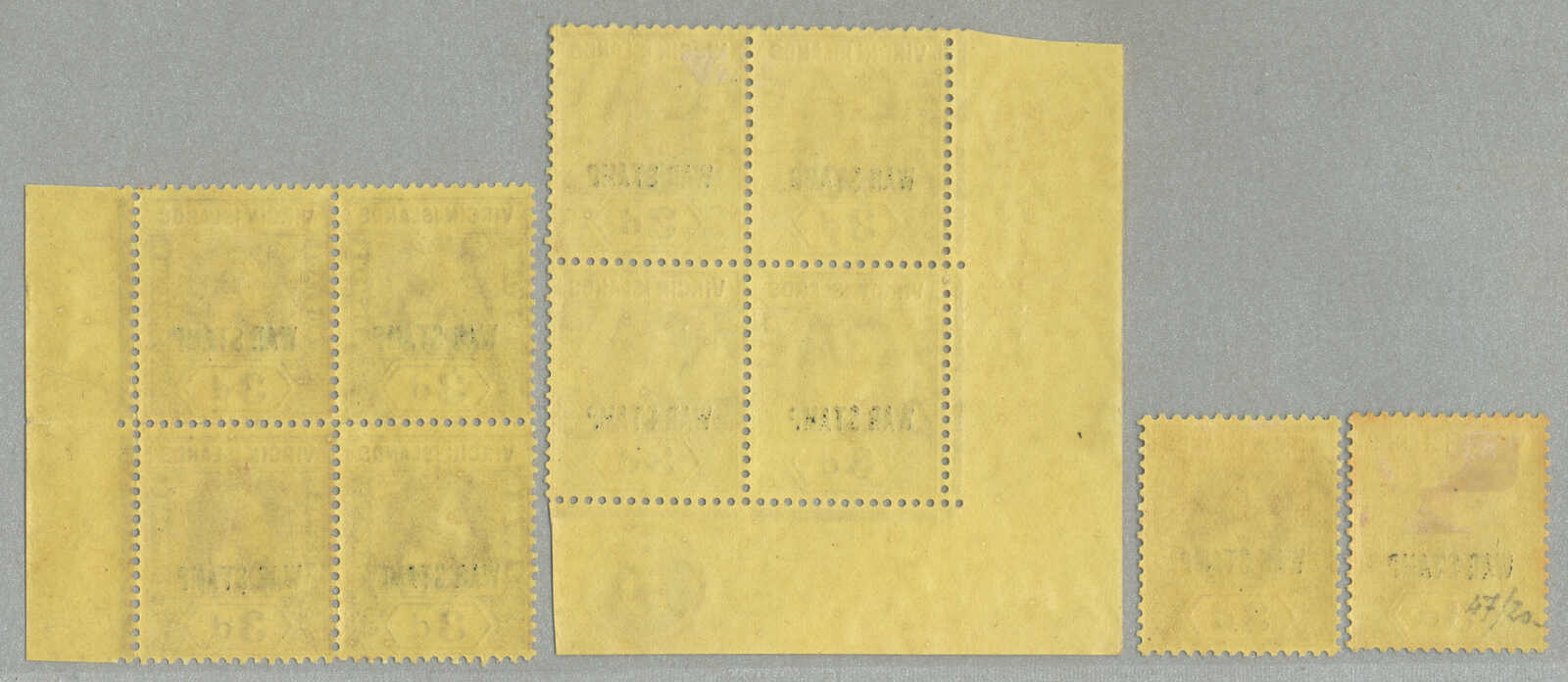 Automatisch generierte Übersetzung: 1916-19, zwei Blocks von 2x 2, und Farbtöne vom Krieg Wertzeichenaufdruck, 3 d., purpur auf gelbem Papier, Zähnung 14, Blocks mit Rand befestigt, mit Plattennummer 5,