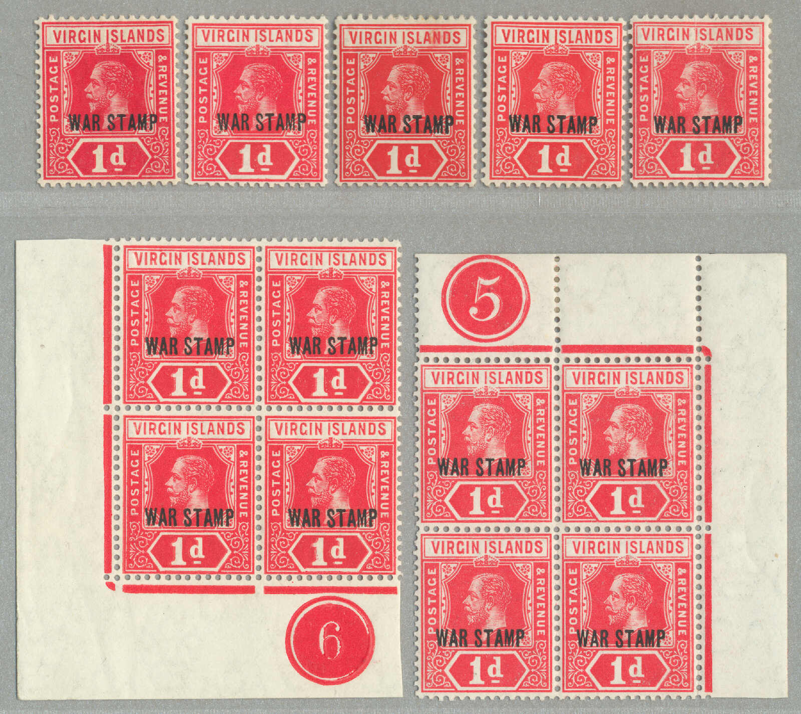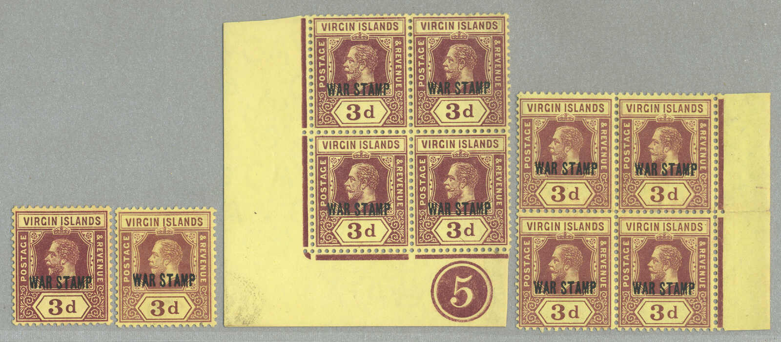 1916-19, two blocks of 2x2, and shades of the war stamp opt, 3d., purple on yellow paper, perf 14, blocks with margin attached, bearing plate no 5, LPOG, other blocks lower left stampt with short opt, fresh and desirable,