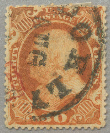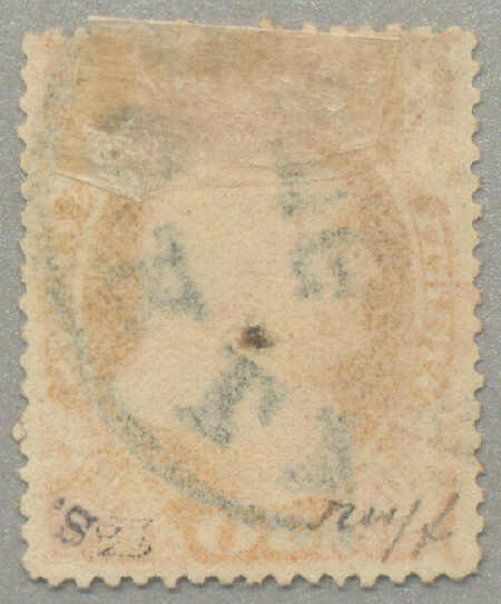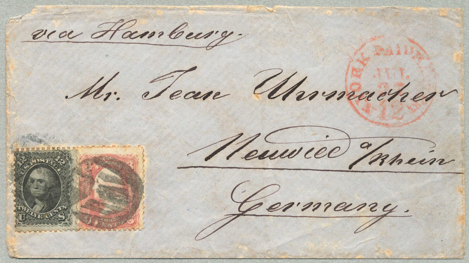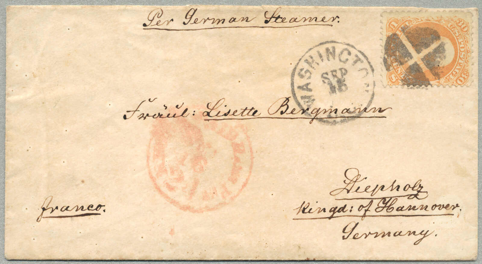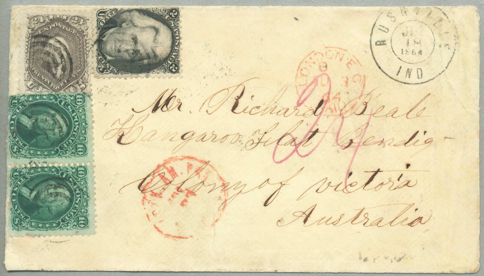 prepaying 46 cents for a 1/2 ounce ship letter via Marseilles to Victoria, m/s 24 (cents) credit to England for forwarding, minor cover repairs on the flap on reverse, otherwise a scarce and attractive franking, route - departed Rushville, Indiana 18 July 1864 overland and by rail to Quebec, Allan Line, departed Quebec, Canada (23 July) to Liverpool (2 Aug), by rail via London (3 Aug) to Southampton, P&O Line, departed Southampton (20 Aug) per Delta via