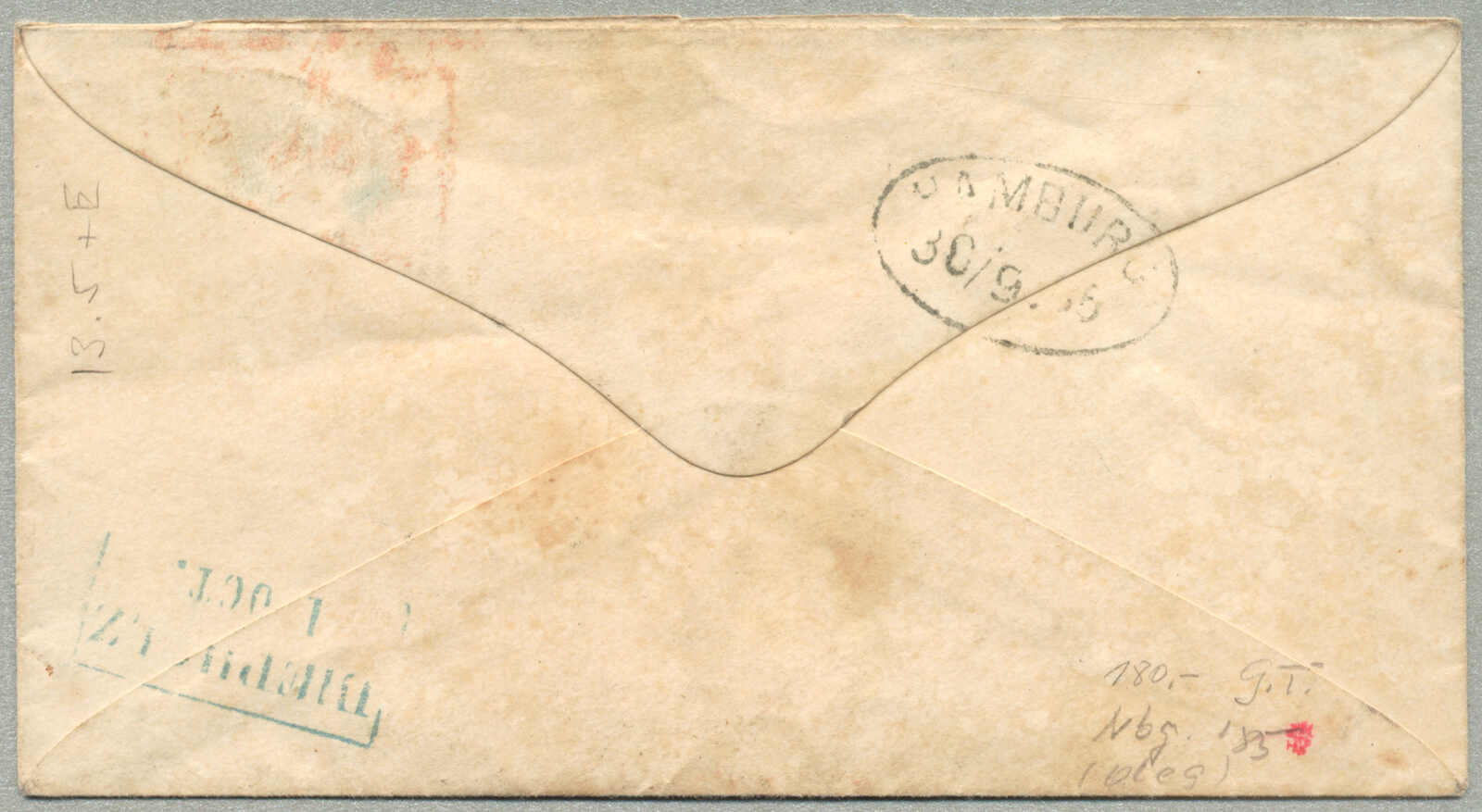 Malta (29 Aug) to Alexandria (2 Sept), overland to Suez, Bengal (4 Sept) to Galle (19 Sept), Madras via King Georges Sound (7 Oct) to Melbourne (13 Oct), by rail to Bendigo, arriving 15 Oct 1864 (89 days), description enclosed, a beautiful cover, VF-XF! Estimate 3.500€.