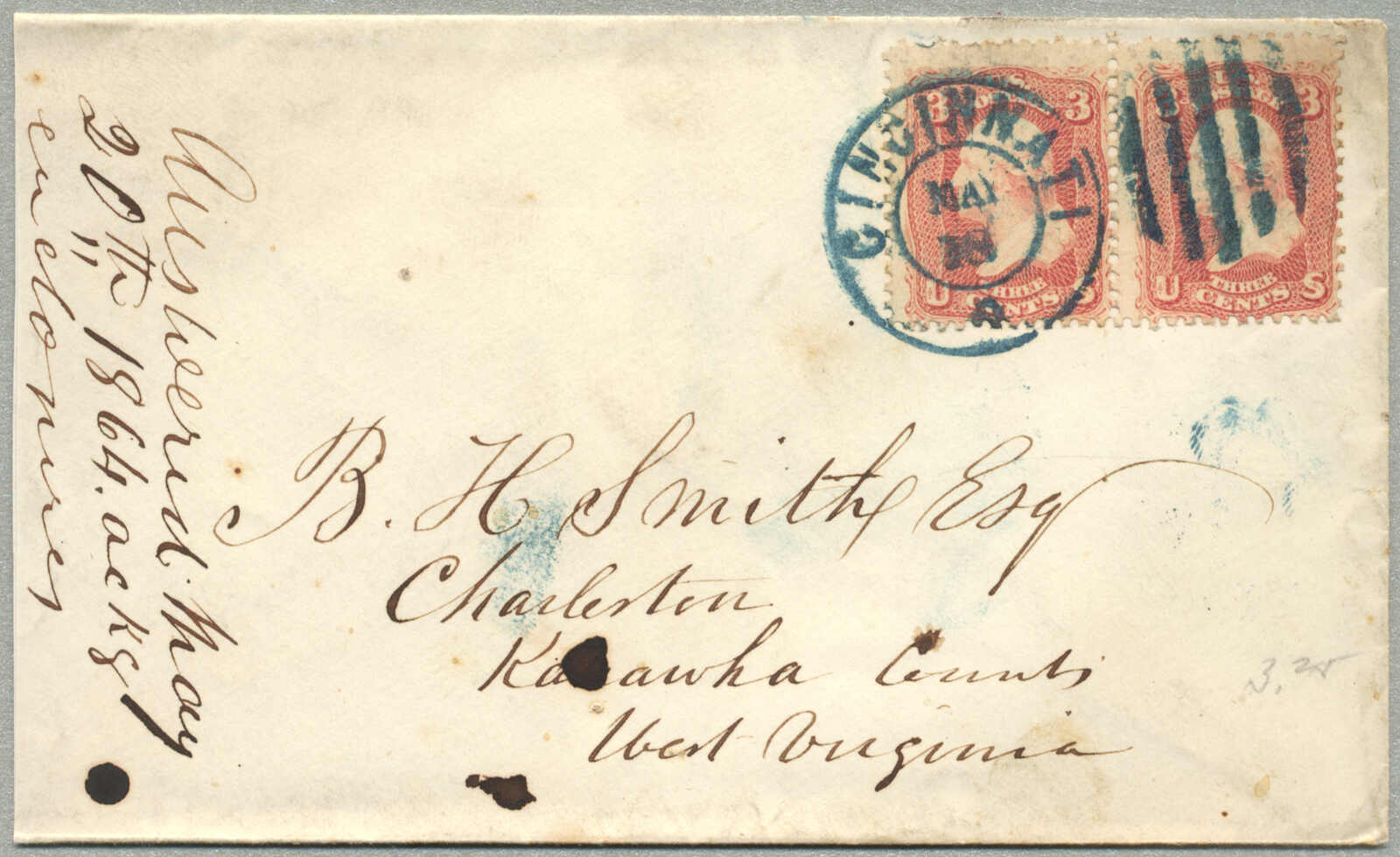 1864, Incoming Mail Overland via Southampton. 2 c. Blackjack, 10 c. green pair, small perf. faults at base and 24 c. brown-lilac, on cover from Rushville, USA to Kangaroo Flat, each cancelled by circular grid handstamps and