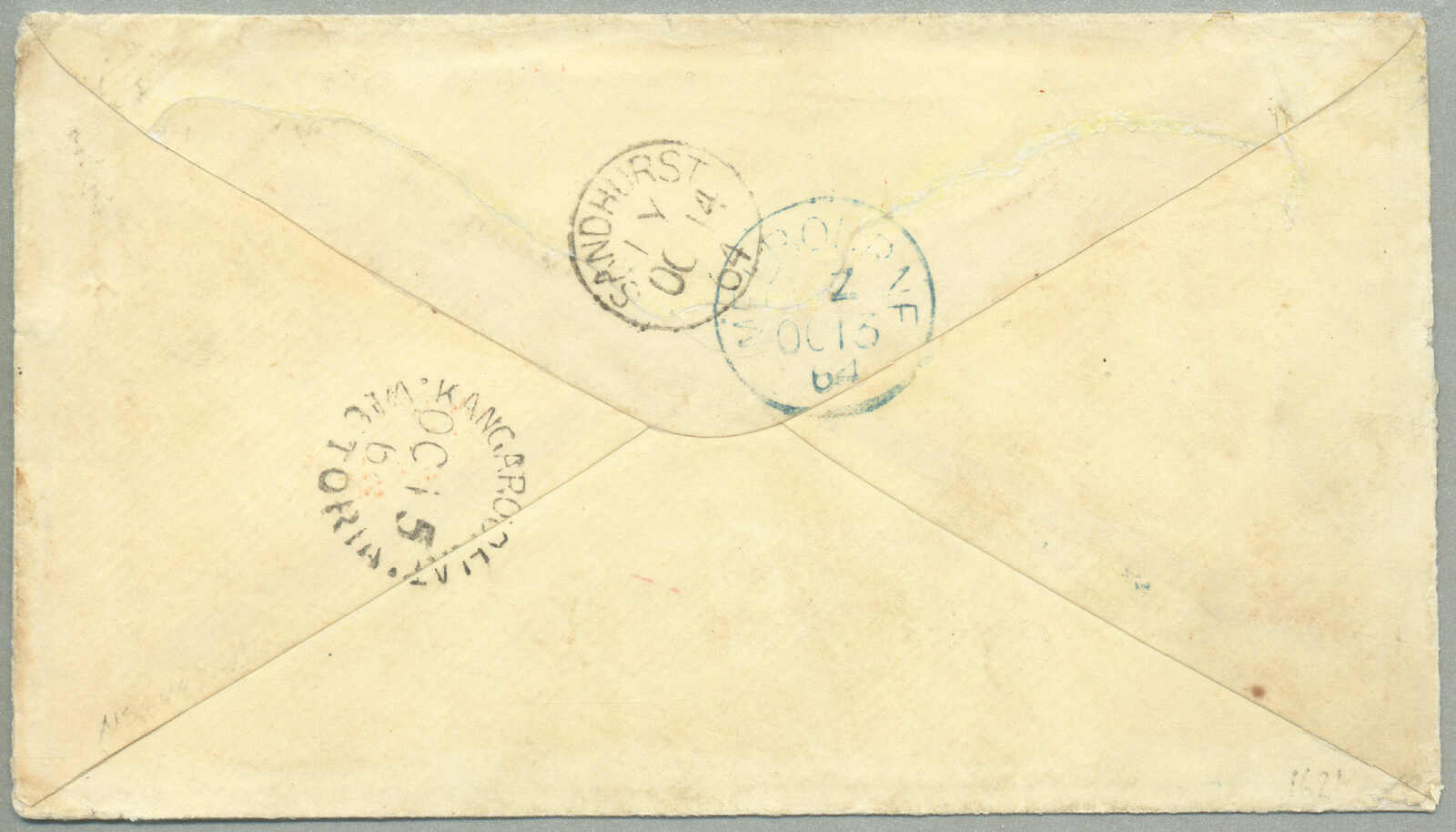 Sept), Madras über König GEORGEN einwandfrei (7 Oct) nach Melbourne (13 Oct), mit der Eisenbahn nach Bendigo, ankommend 15 Oct 1864 (89 Tage), Beschreibung anbei, ein wunderschöner Umschlag, VF-XF! Schätzpreis 3. 500. (Scott 73, 68, 70a) (Image) (imagea)