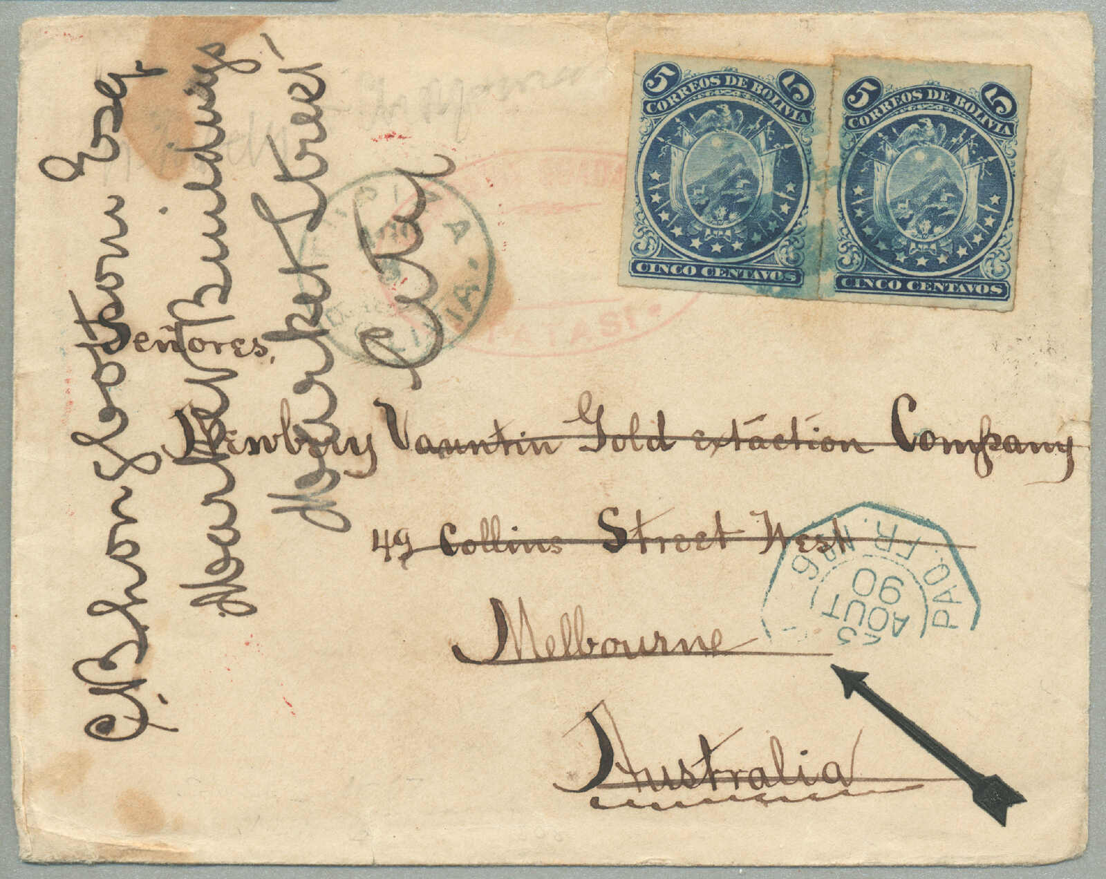 kleinere Brief verunstaltet, aber eine seltene Ursprung nach Australien, vermutlich der einzige Brief verzeichnet ab Bolivien an die Australische Kolonien, Strecke: abgefahren Tatsi 14 Aug 1890 Überland über Jujuy (19 Aug) nach Buenos Aires,