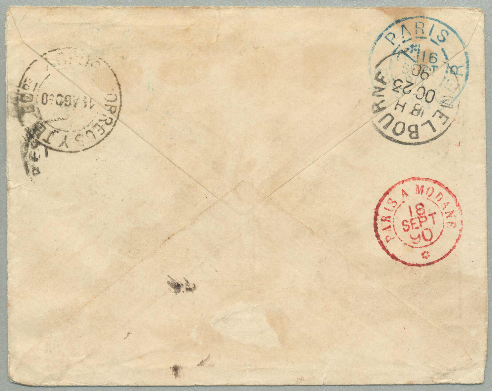 Naples and with multiple transit datestamps on the reverse, on arrival in Melbourne, the cover was locally redirected, minor cover blemishes, but a rare origin to Australia, believed to be the ONLY cover recorded from Bolivia to the Australian Colonies, route: departed Tatsi 14 Aug 1890 overland via Jujuy (19 Aug) to Buenos Aires, French steamer Nerthe, departed Buenos Aires (23 Aug) to Bordeaux (15 Sept), by rail via Paris (16 Sept) and Modane (18 Sept) to