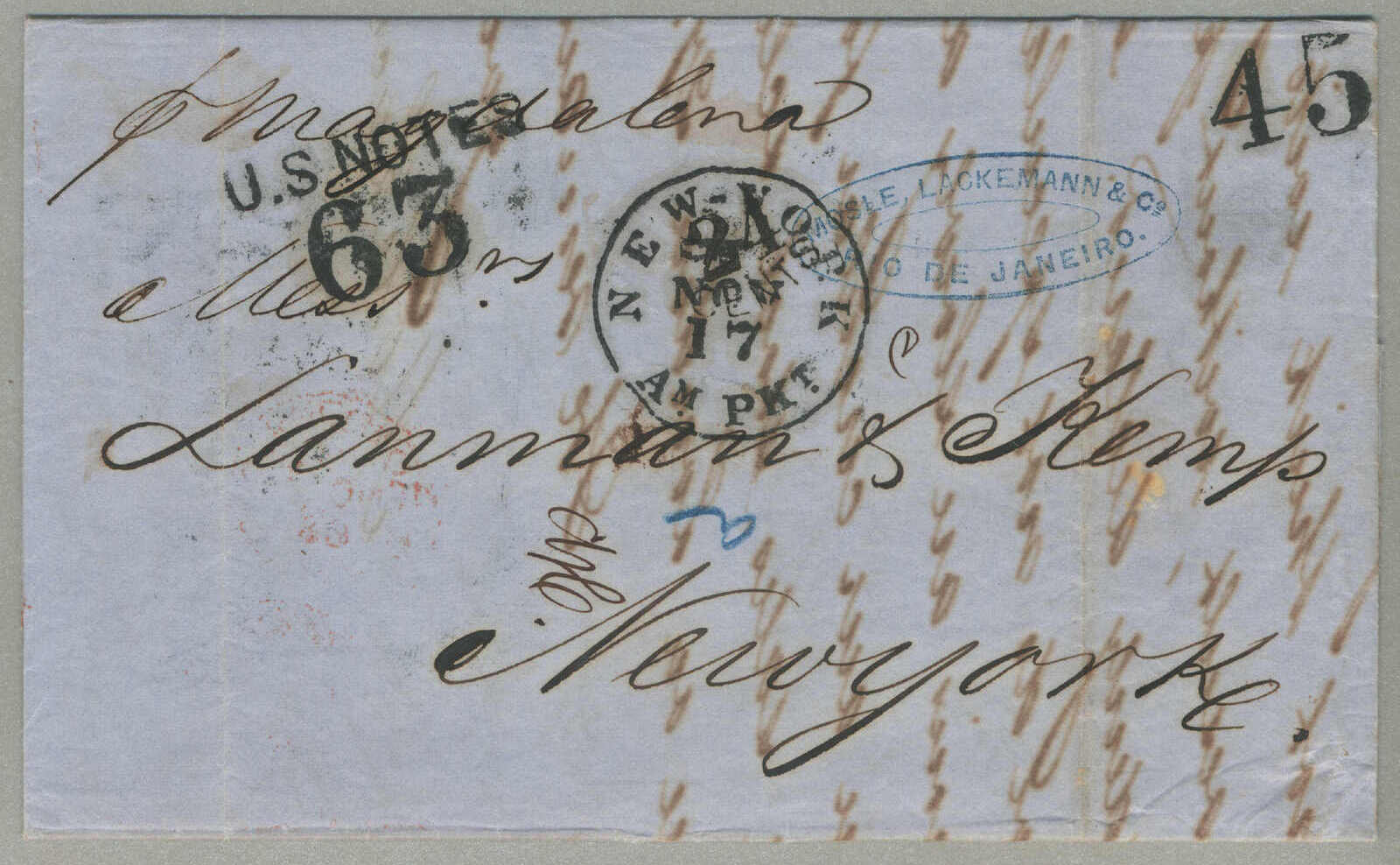 Automatisch generierte Übersetzung: 1890, eingehende Post Überland über Neapel, 5c, blau, durchstochen, (2), auf Brief aus Tatsi, Bolivien nach Melbourne, Victoria, gestempelt mit rosa