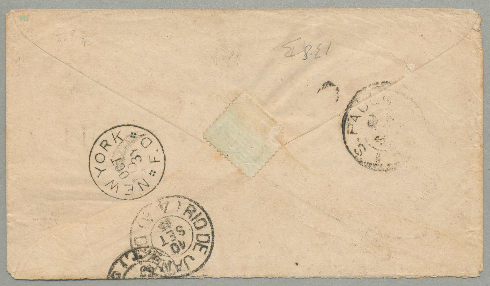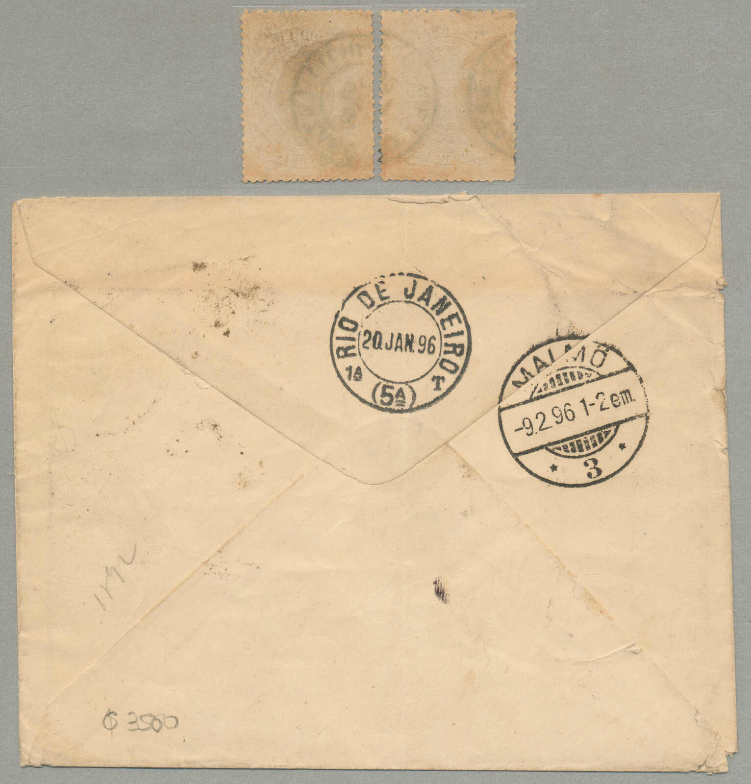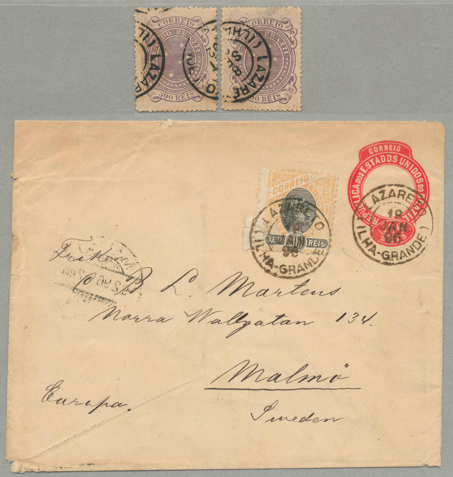 Republicana series, postmarked January 19, 1896, on reverse, a Rio de Janeiro postmark dated January 20, 1896, and an arrival date in Malmö dated February 9, 1896, as an addition two 300 Reis stamps with the same Lazaretto postmark are