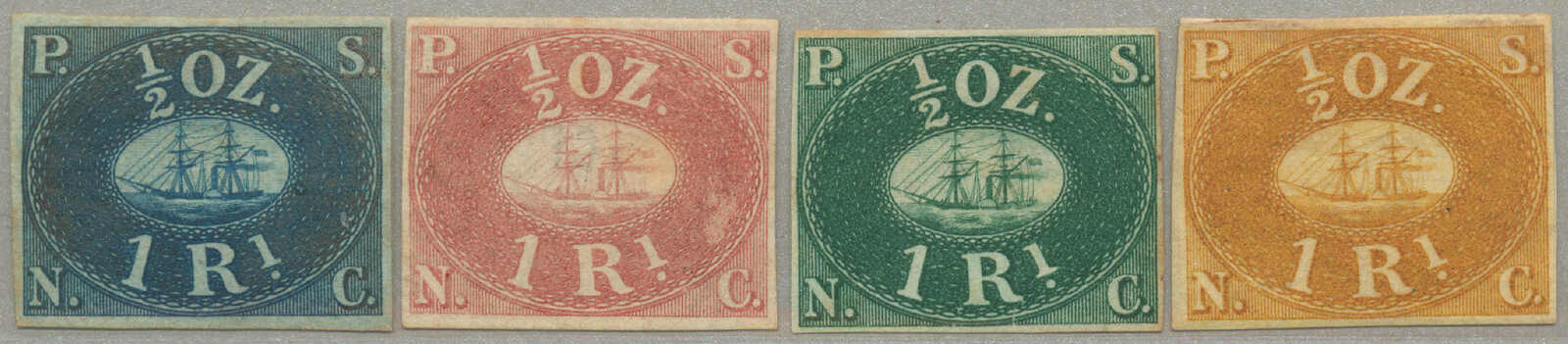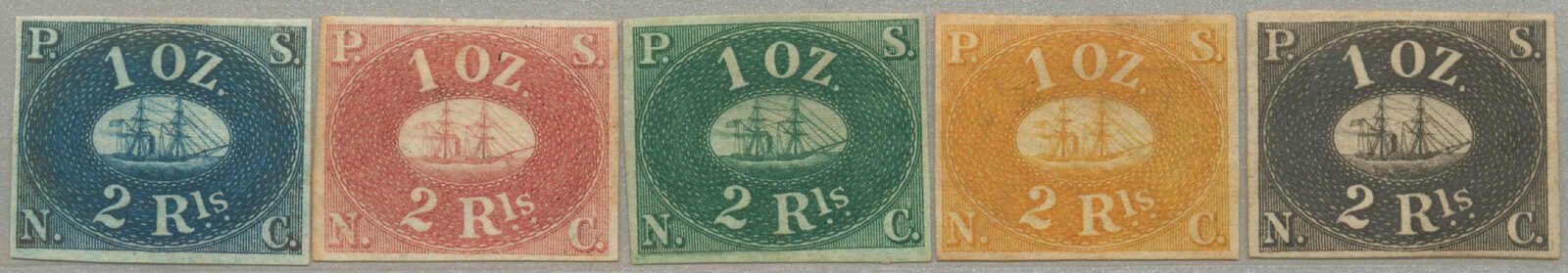 Automatisch generierte Übersetzung: 1863,2 r. Satz von 5, in tiefblau, rotbraun, dunkelgrün, orangegelb und schwarz, ungezähnt, 4., weiß Handpapier, ohne Gummi, noch voll- bis breitrandig, VF-XF! Schätzpreis 1. 000. (Scott 2, 4th reprint) (Image) (imagea)