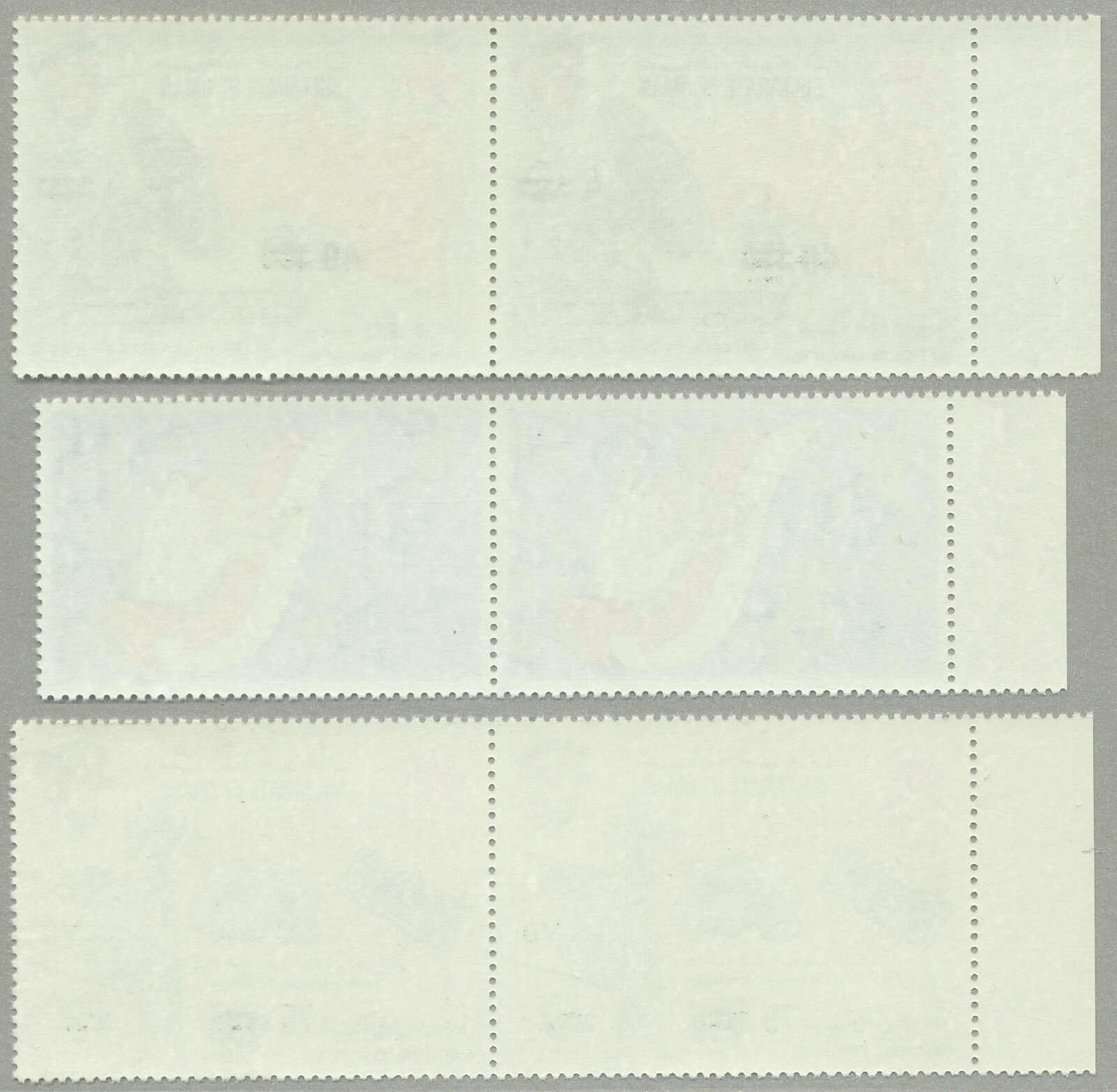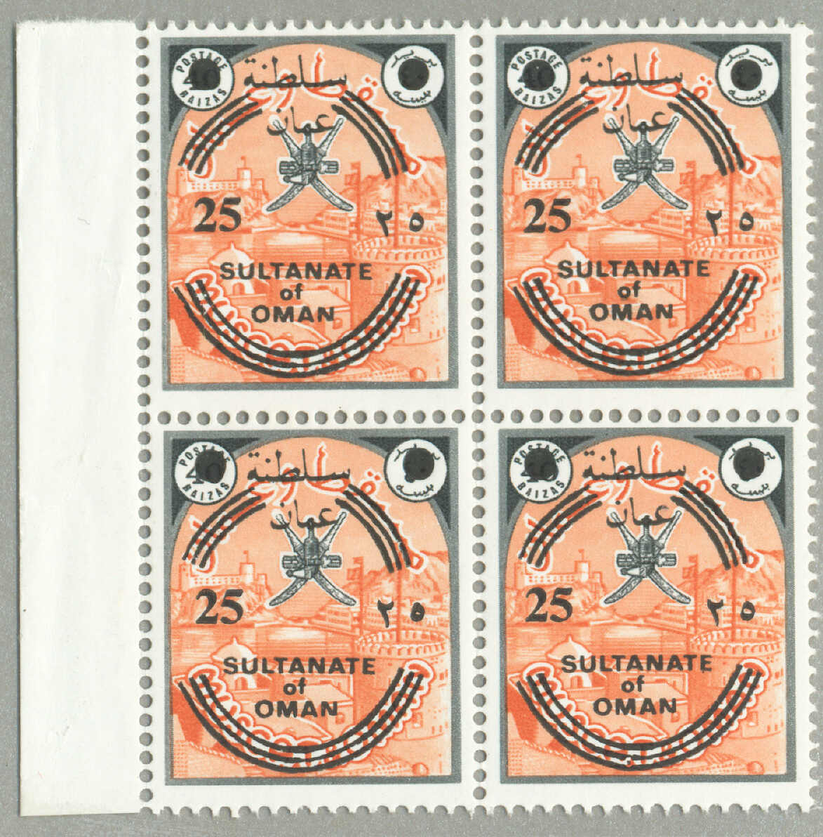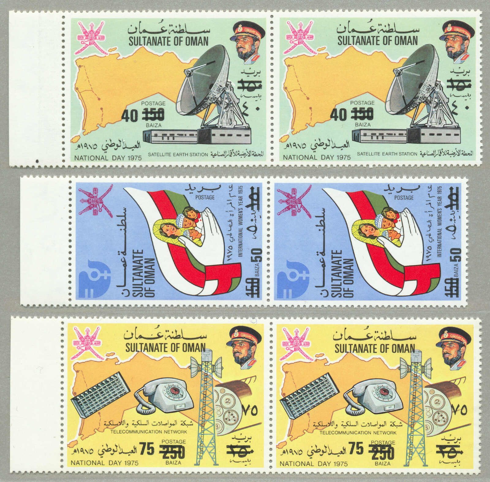 1978, July 30, Provisionals, National Day/40 b on 150 b, Year of the Women/50 b on 150 b and National Day/75 b on 250 b, blocks of (4) with left margins, LPOG never hinged, the rarest set of Oman, exceptional fresh and