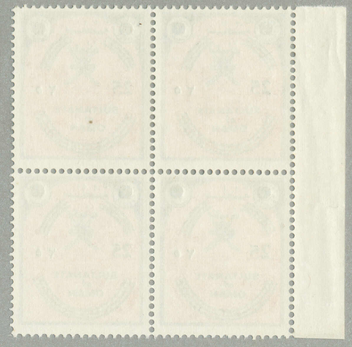 Nationalfeiertag / 75 b auf 250 b, Viererblocks mit links Ränder, großer Teil Originalgummi postfrisch, die seltenste Satz von Oman, außergewöhnlich frisch und gesucht, für den fortgeschrittenen Oman Sammler, Katalogwert £11400, SUP! Schätzpreis 13.
