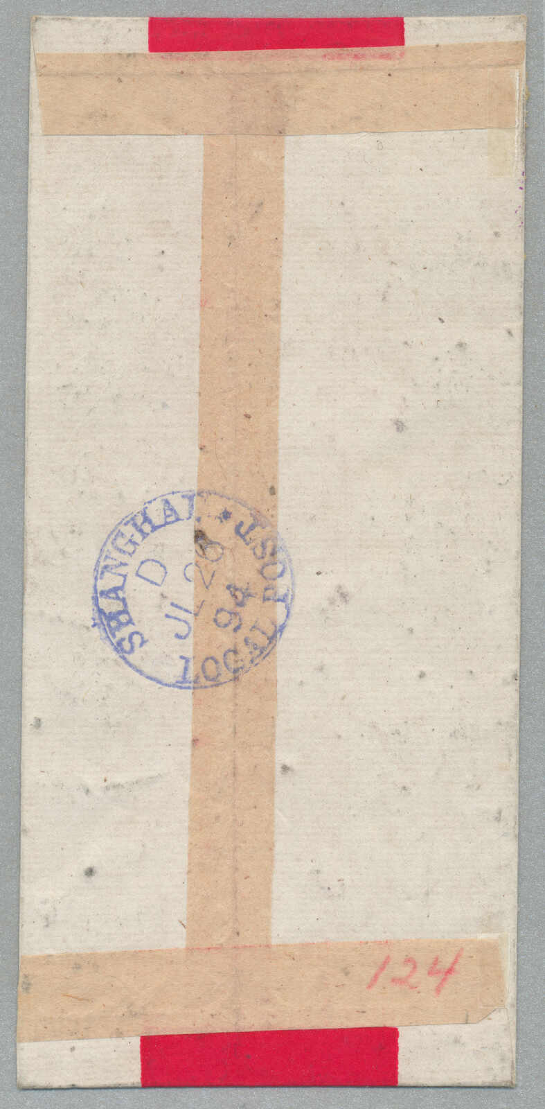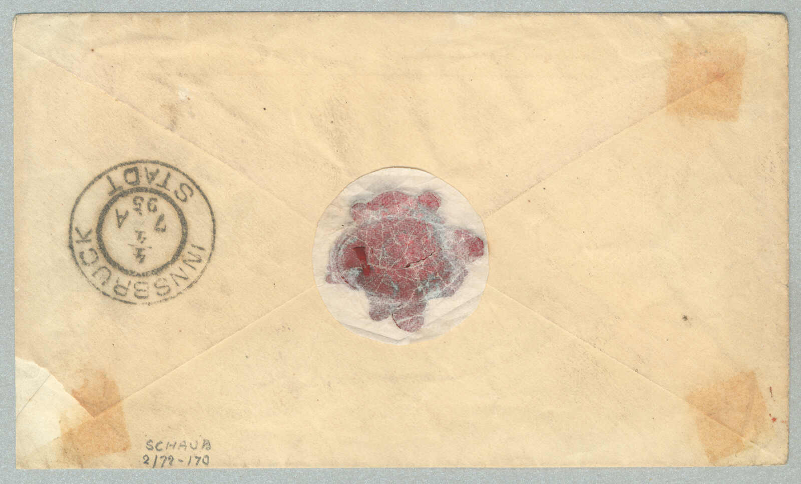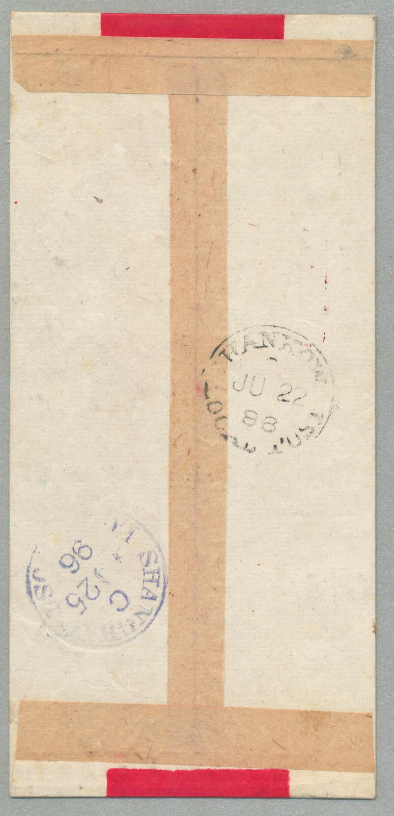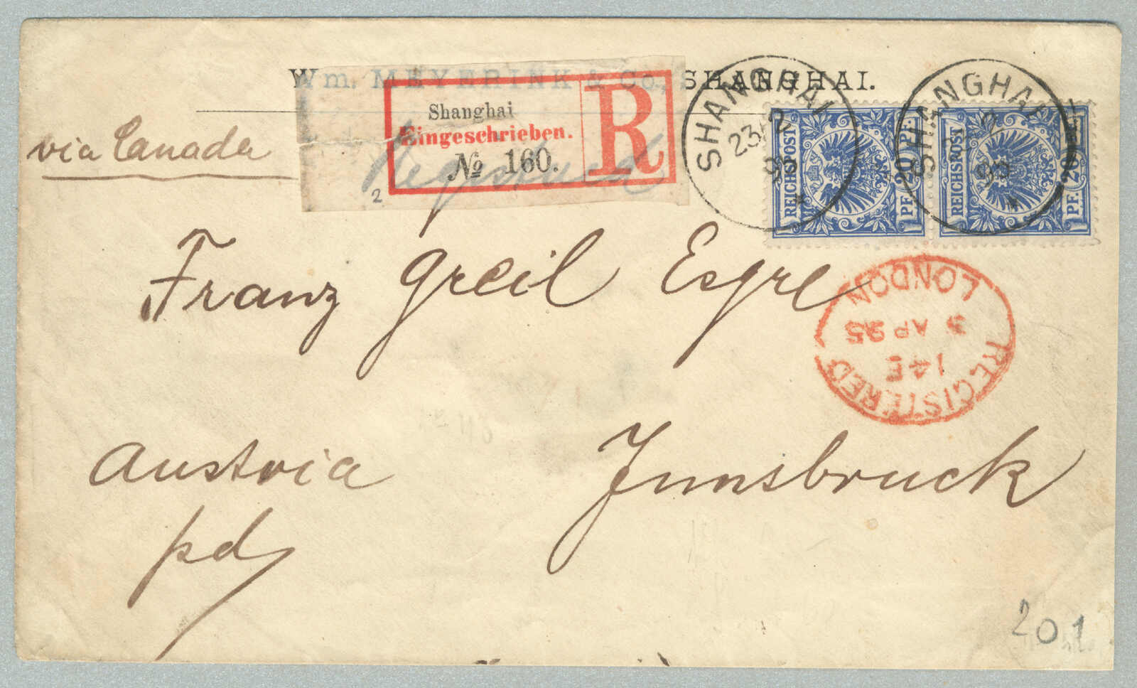 Automatisch generierte Übersetzung: 1895, Deutsche Marken gestempelt in China, 20 + 20 Pf., (2), blau, Paar, auf Einschreibebrief aus SHANGHAI zu Innsbrucker über London, Vermerk oben links handschriftlich über Kanada,