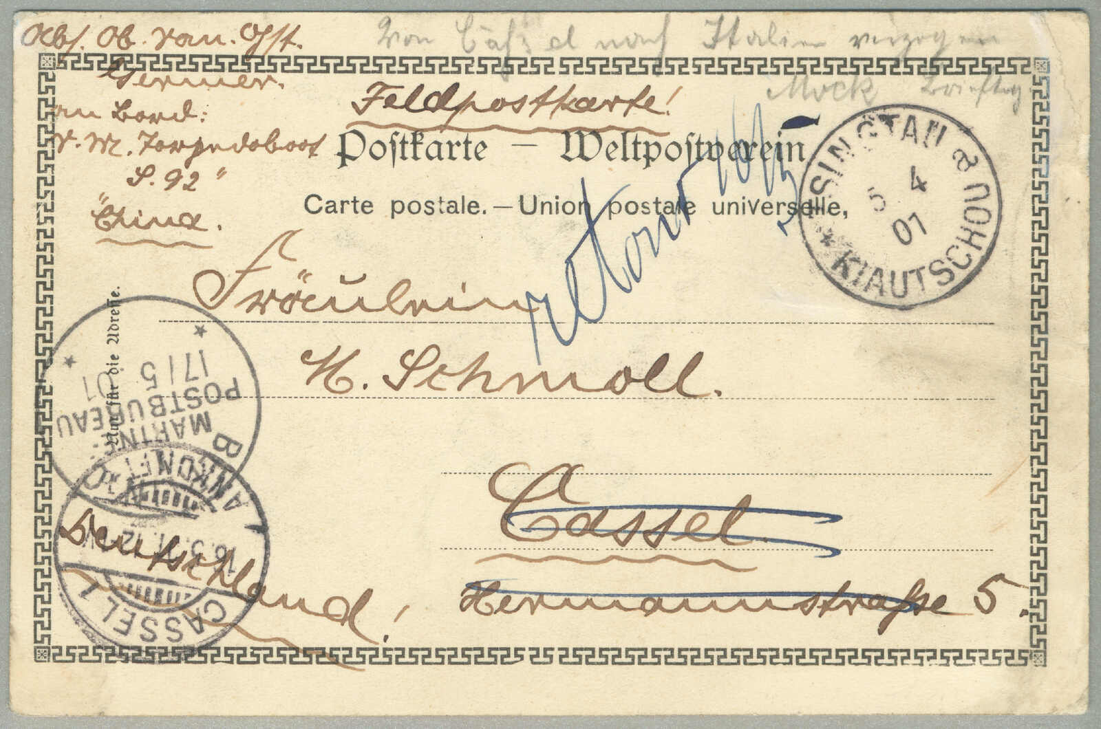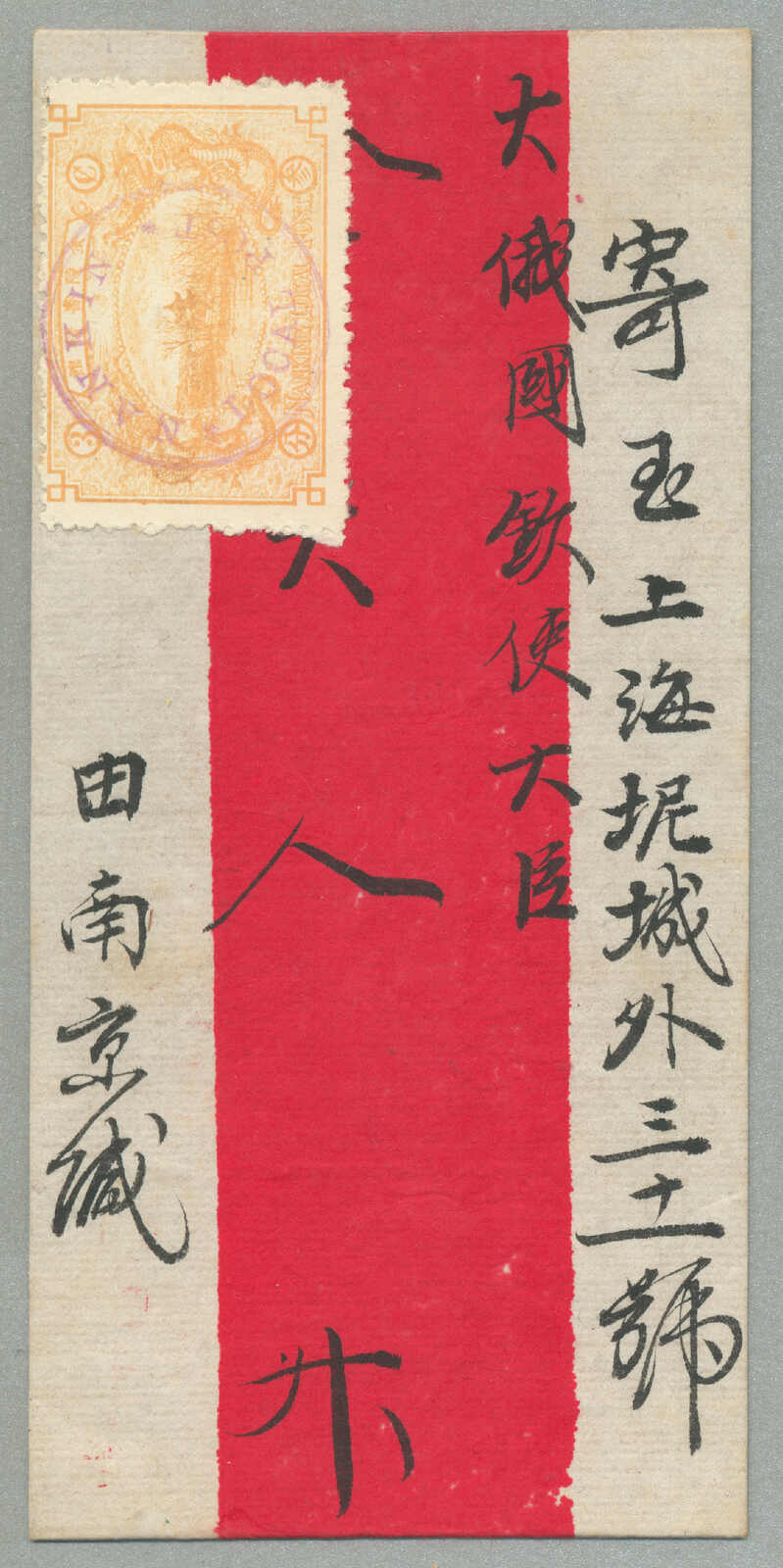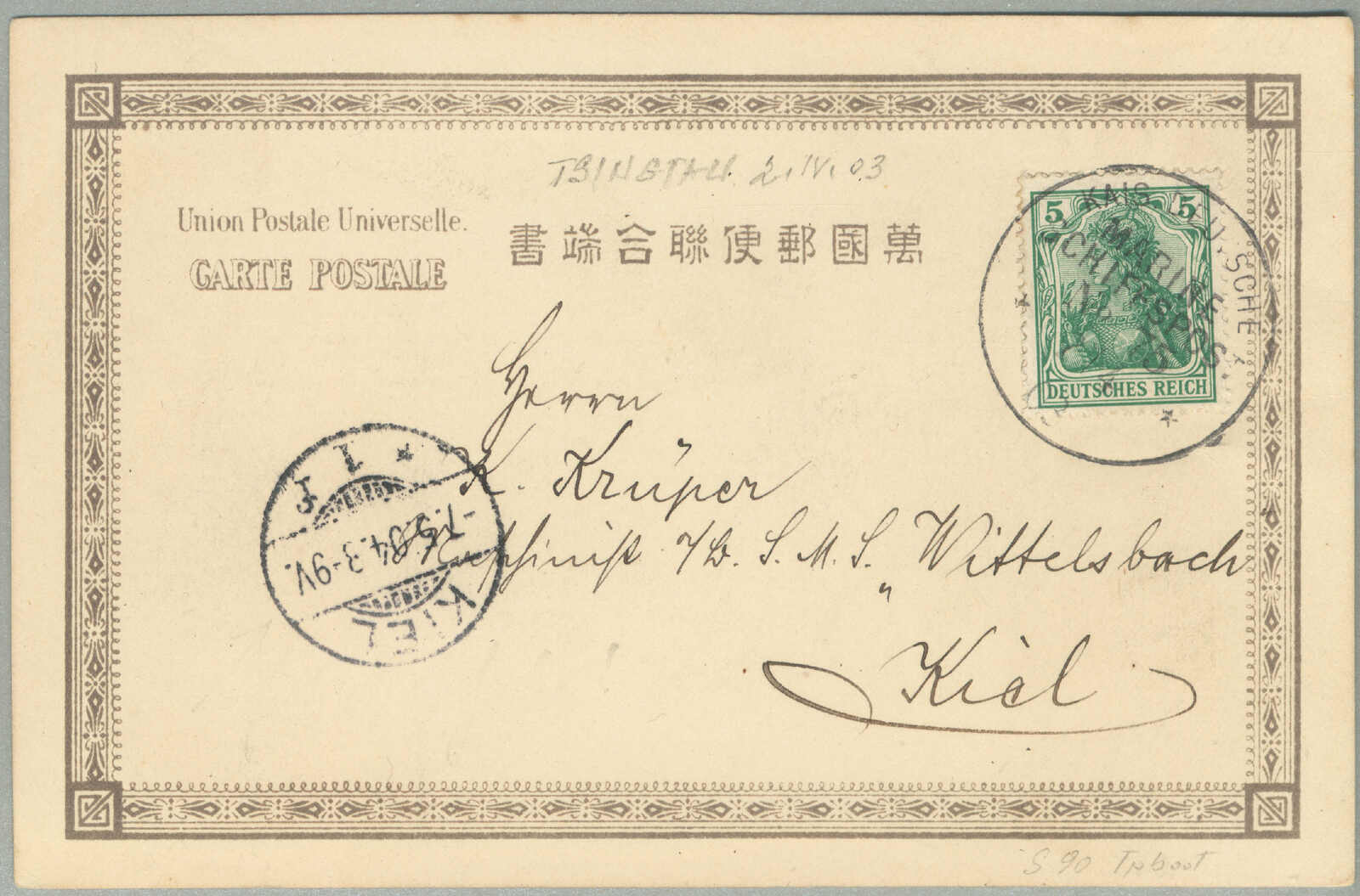 Automatisch generierte Übersetzung: 1895, Deutsche Marken gestempelt in China, 20 + 20 Pf., (2), blau, Paar, auf Einschreibebrief aus SHANGHAI zu Innsbrucker über London, Vermerk oben links handschriftlich über Kanada,