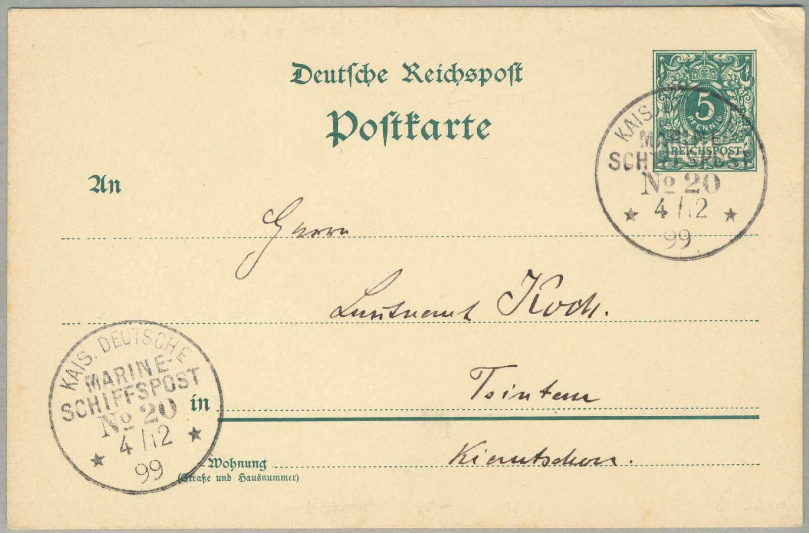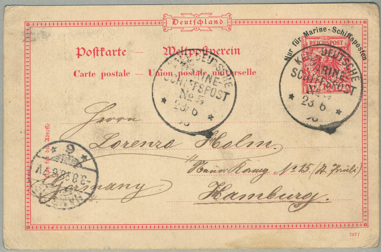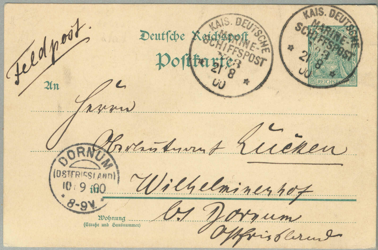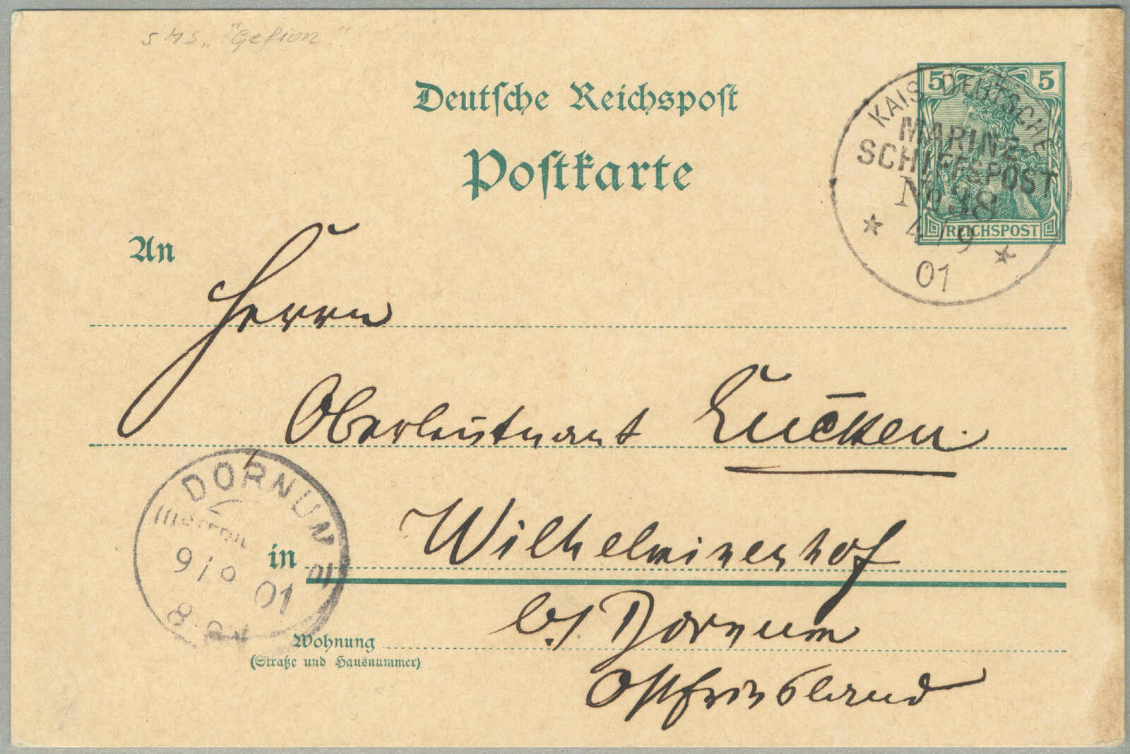 1900, 5pf., green, stationary post card, from the SMS LUCHS in COLOMBO to DORNUM, description enclosed, fresh and desirable, XF! Estimate 450€.