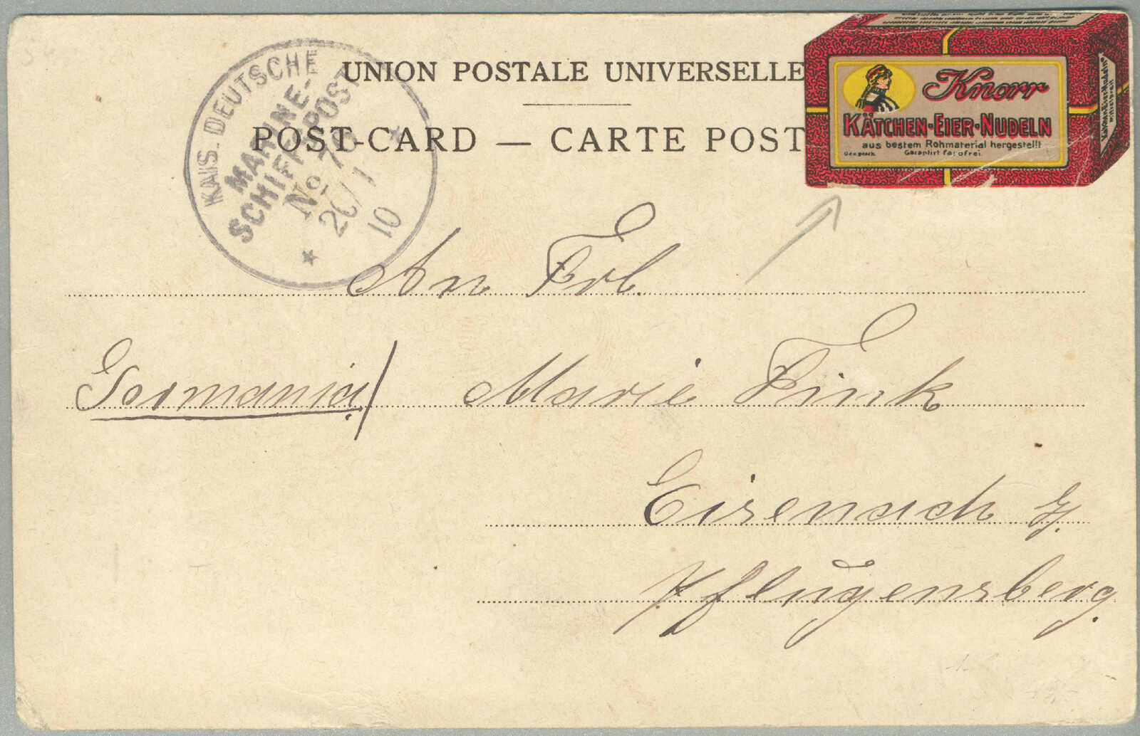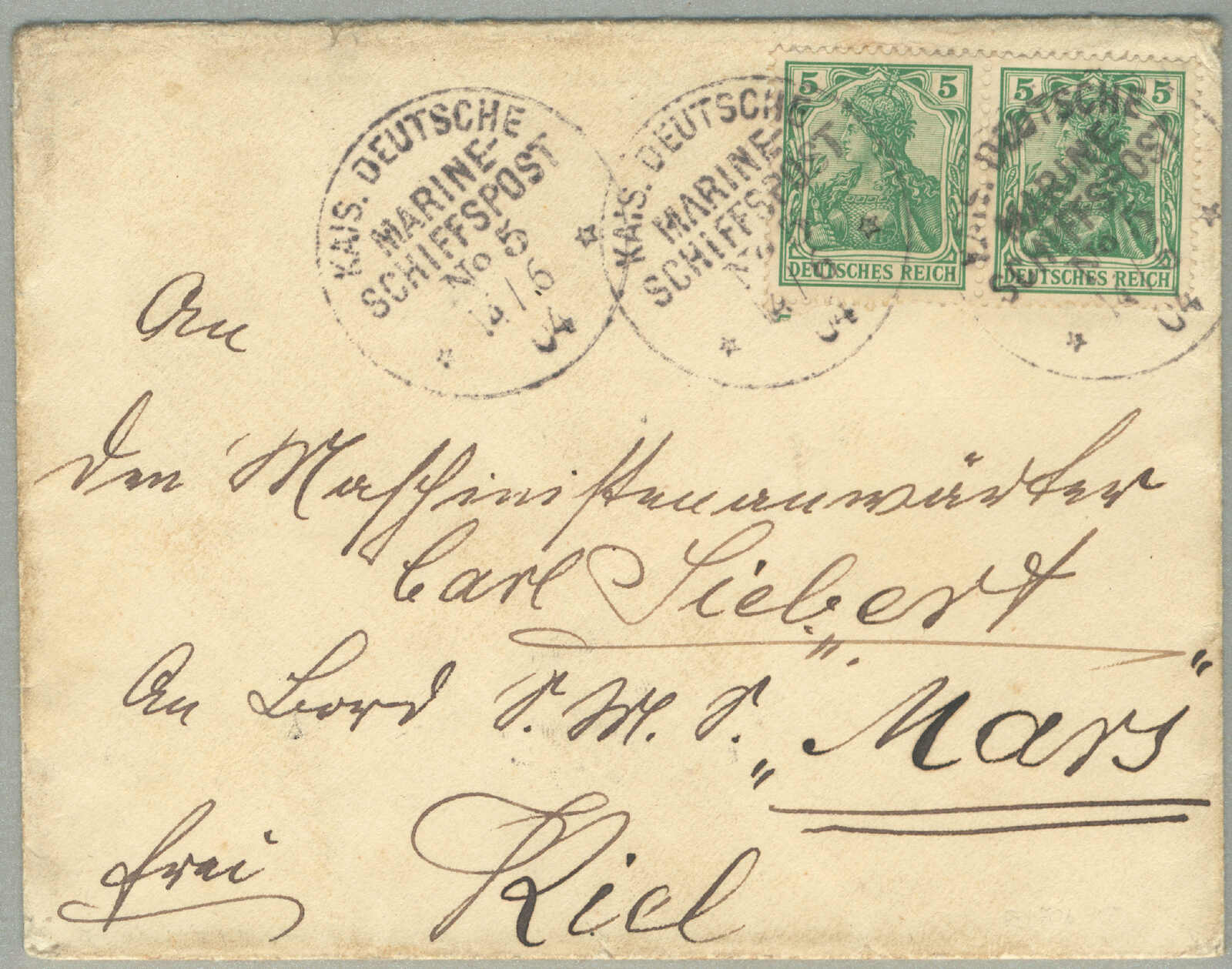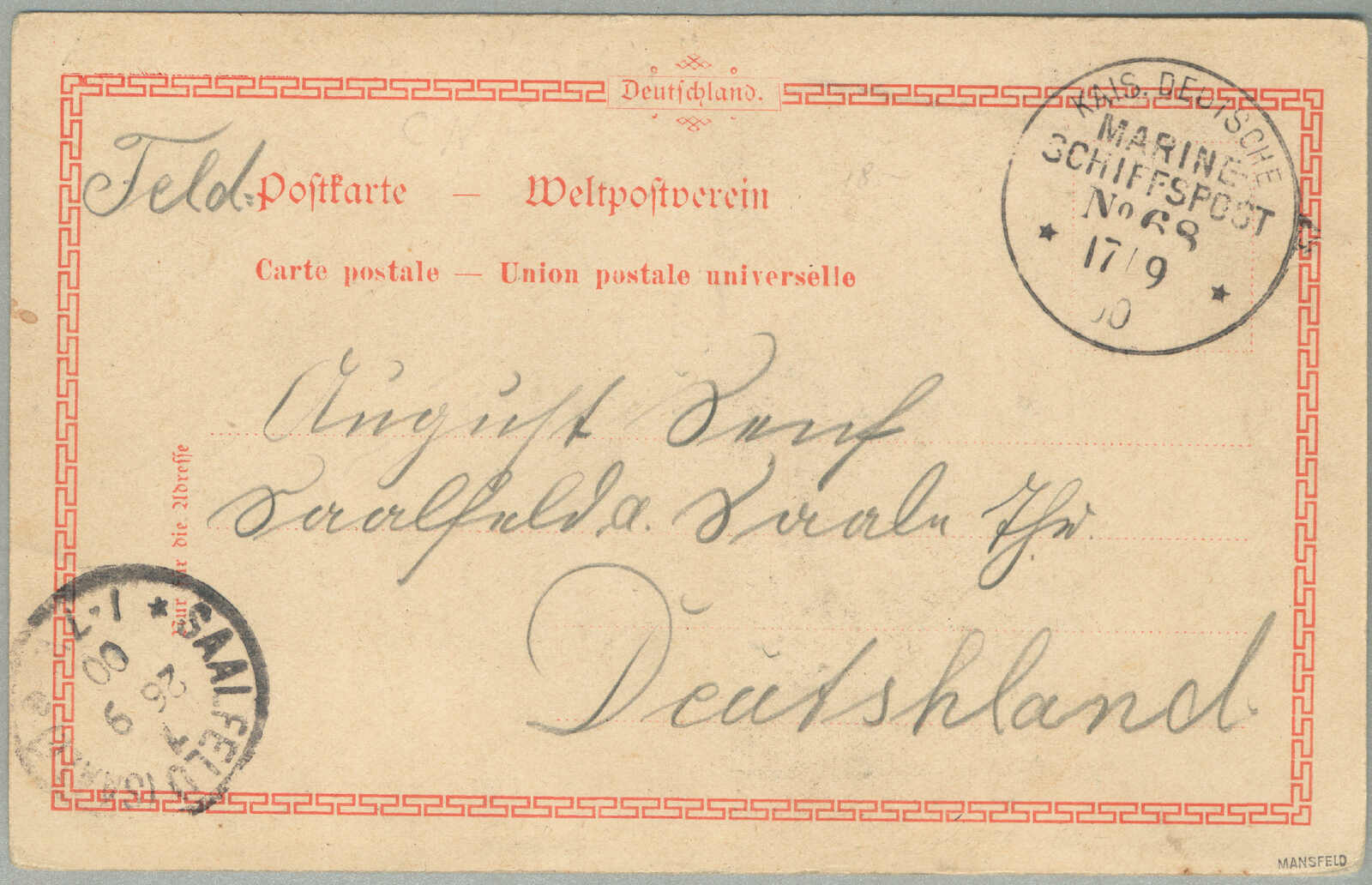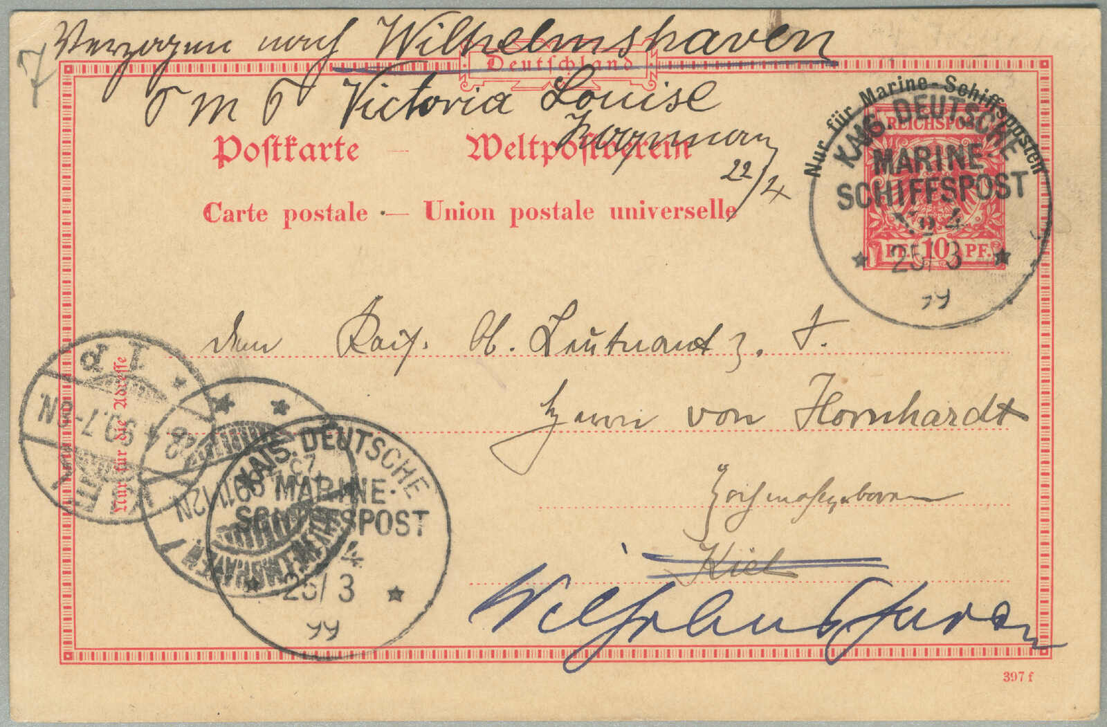 1900, 5pf., green, stationary post card, from the SMS LUCHS in COLOMBO to DORNUM, description enclosed, fresh and desirable, XF! Estimate 450€.