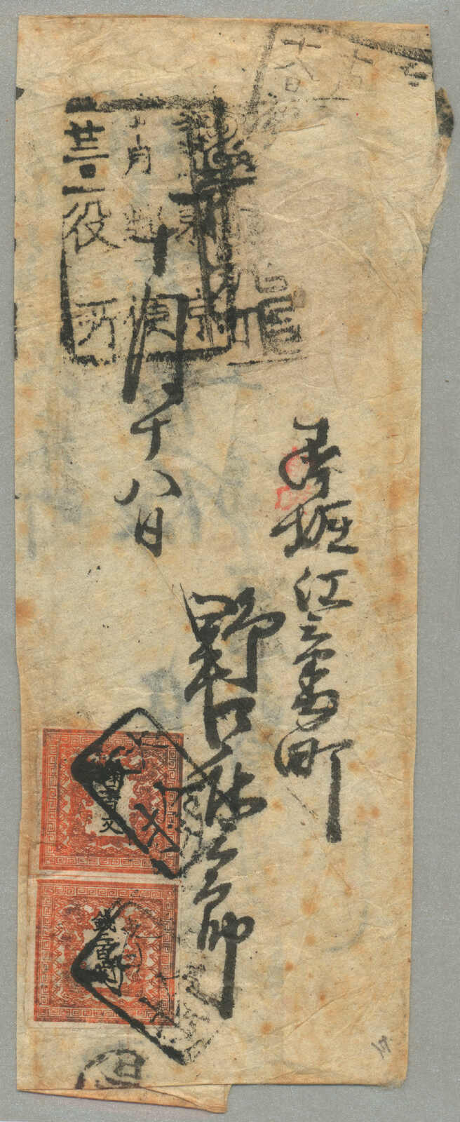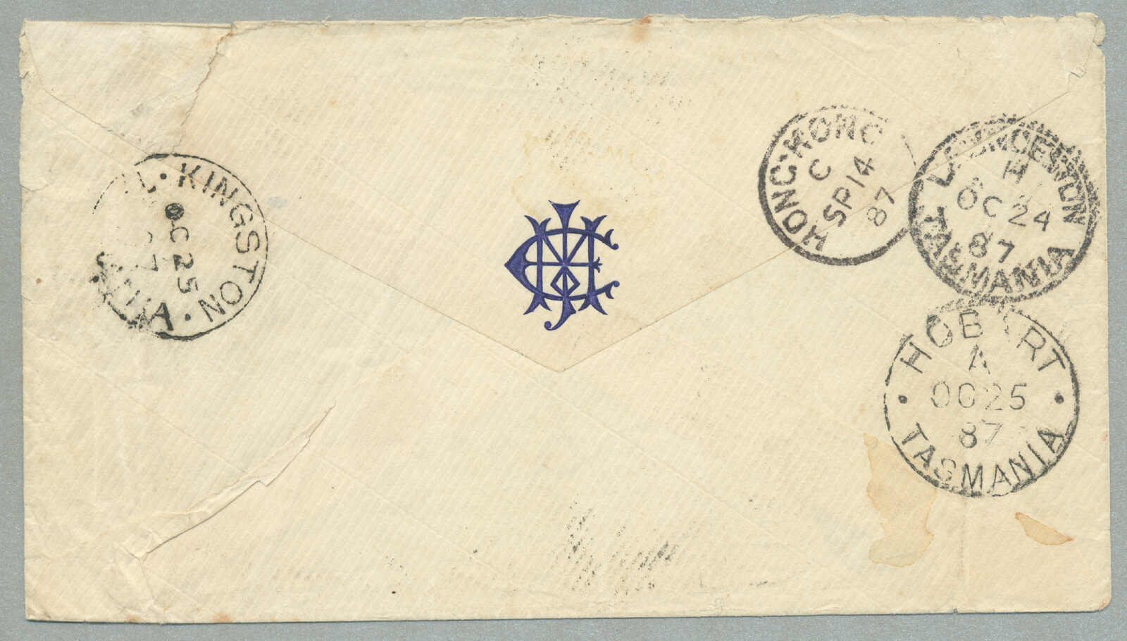 despatch, reverse with Hong Kong transit and arrival datestamps in Tasmania, route - P&O Line: departed Yokohama 11 Sept 1887 per - Tibet - via Kobe (12 Sept), Nagasaki (13 Sept) to Hong Kong (14 Sept). departed Hong Kong (23 Sept)