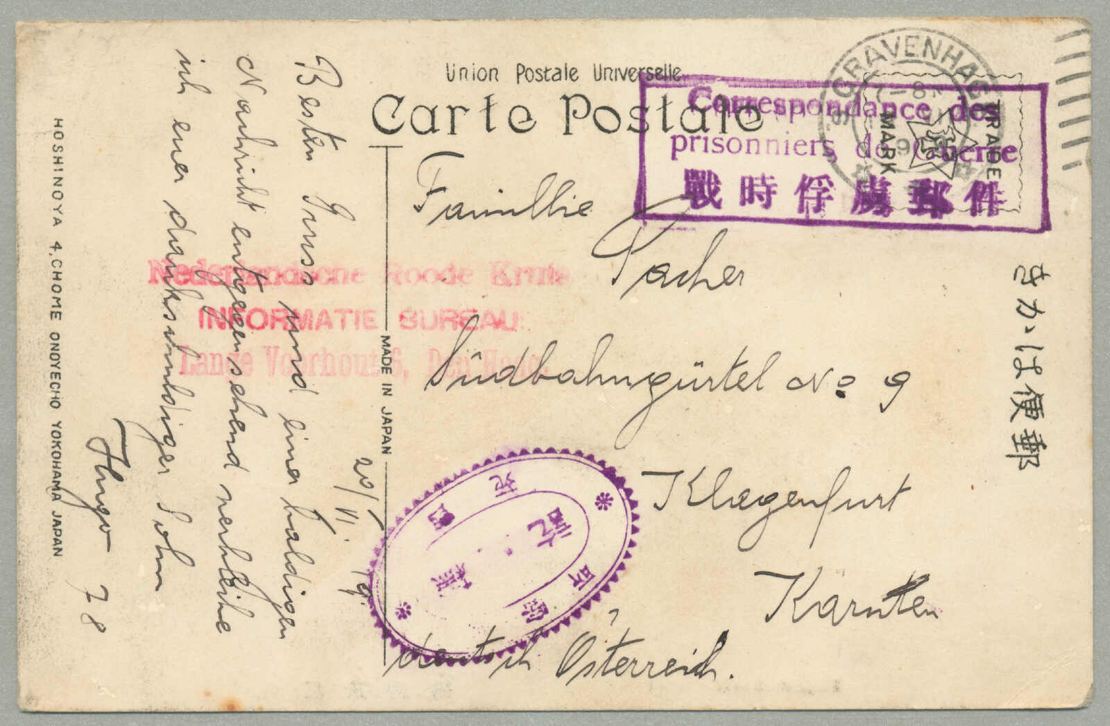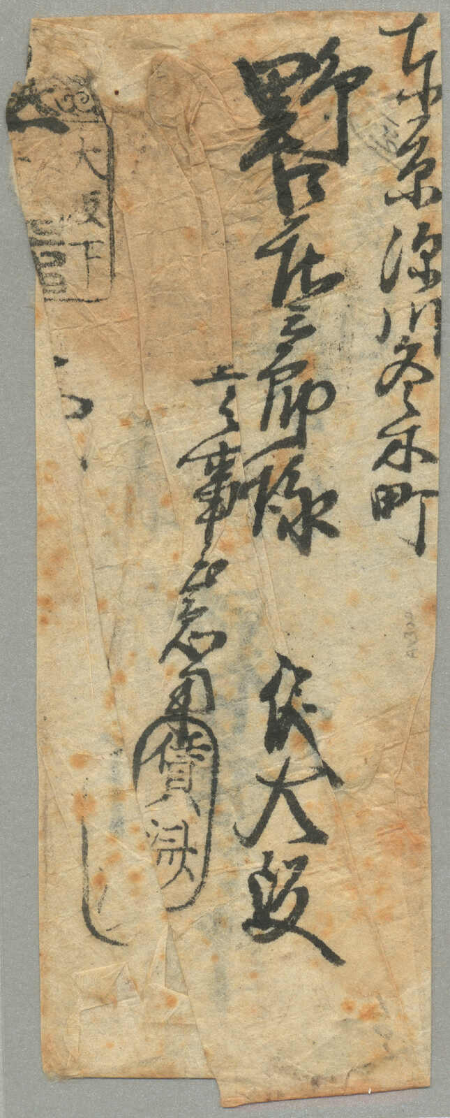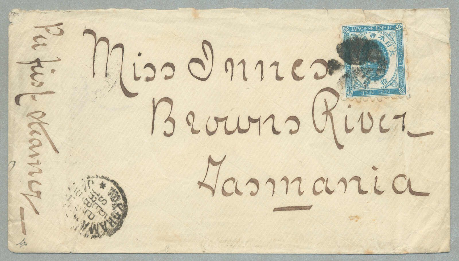 gestempelt und vorauszahlend 10 sen für ein 1⁄2 Unze Schiffsbrief zu Tasmania, Vermerk - mit dem ersten Schiff - auf der linken Seite und mit Yokohama Versand, rückseitig mit Hongkong Transit und Ankunft Datumsstempel in Tasmania, Strecke - P&O
