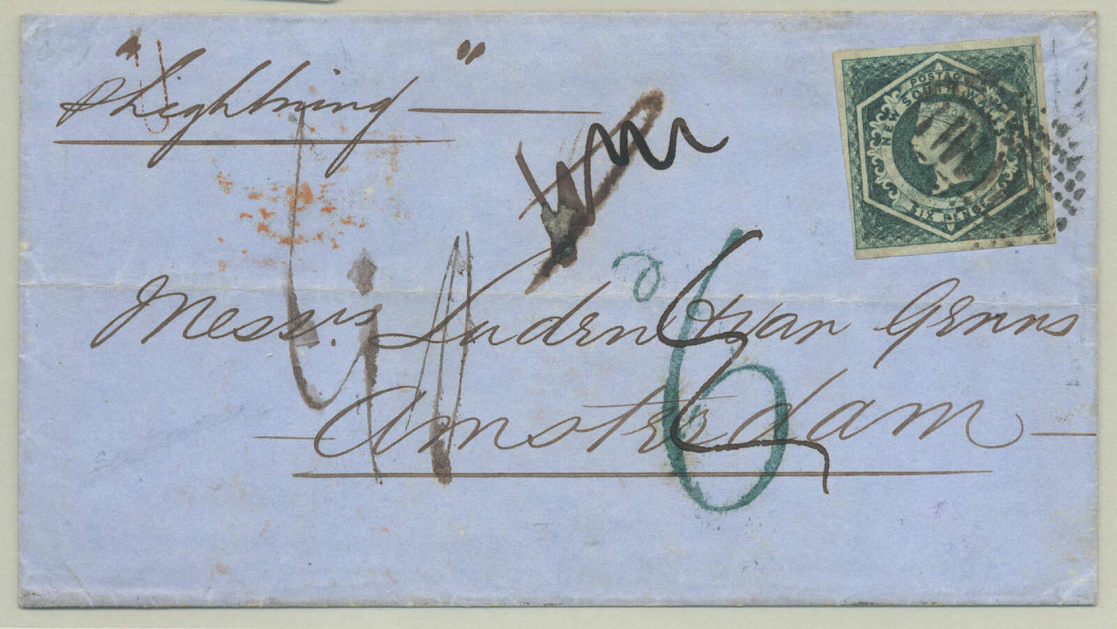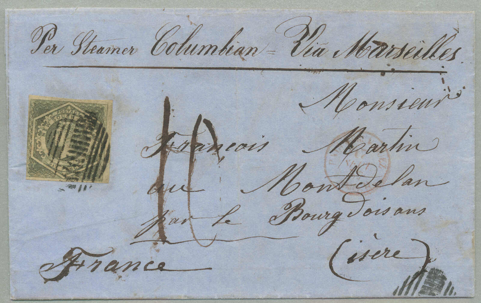 addressed to Switzerland, and routed via Marseilles which avoided the British mail system and the potential postage due, however, it was still grossly underpaid, and not identified by the postal officials of either New South Wales