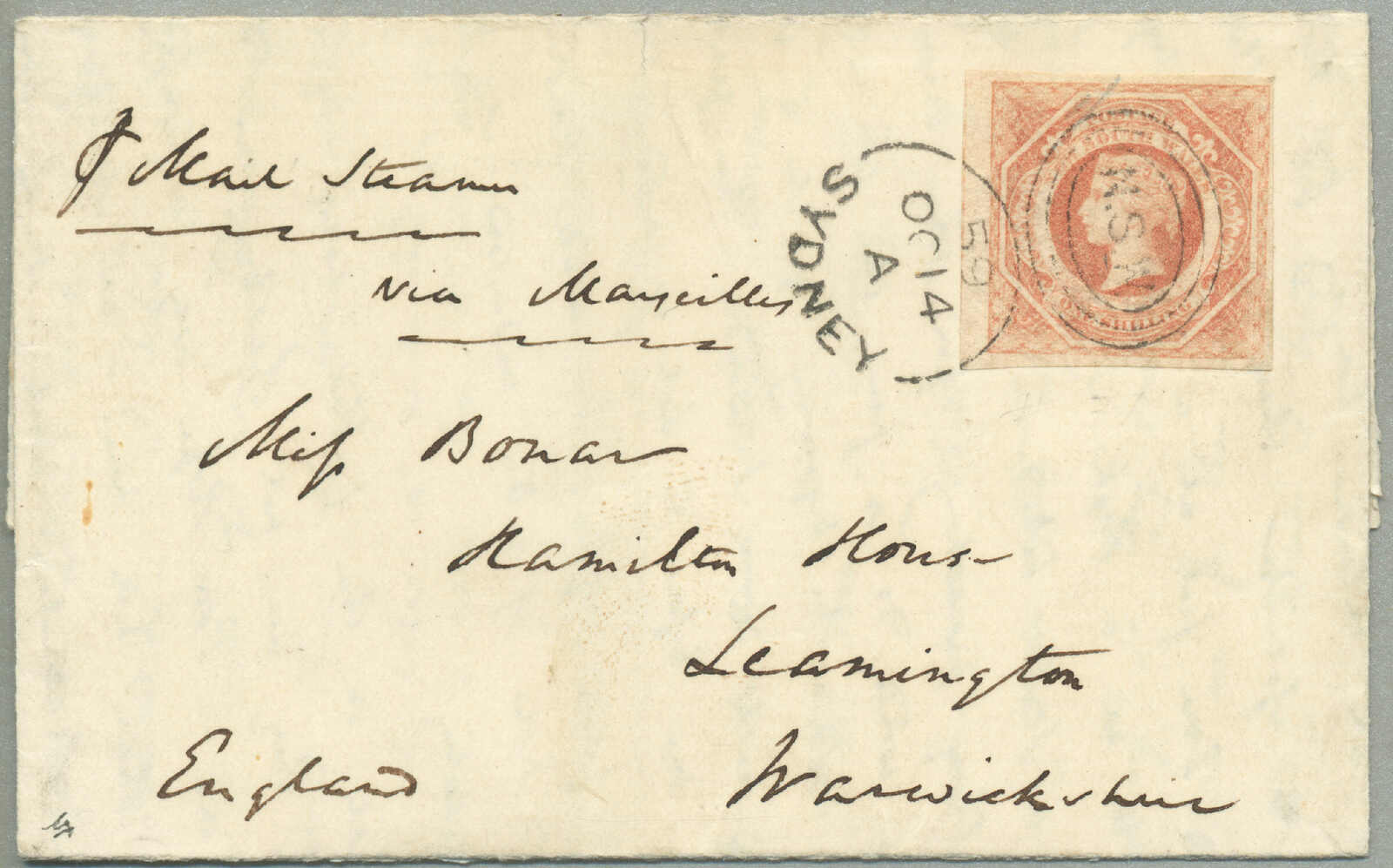 Bestimmungsort für Neusüdwales, Strecke - P&O Linie: abgefahren Sydney 22 Oct 1864 per Bombay zu Galle (15 Nov), Simla (17 Nov) nach Suez (3 Dec), Überland nach Alexandria, Euxine (5 Dec) über Malta (8 Dec) nach Marseilles, mit der Eisenbahn ab