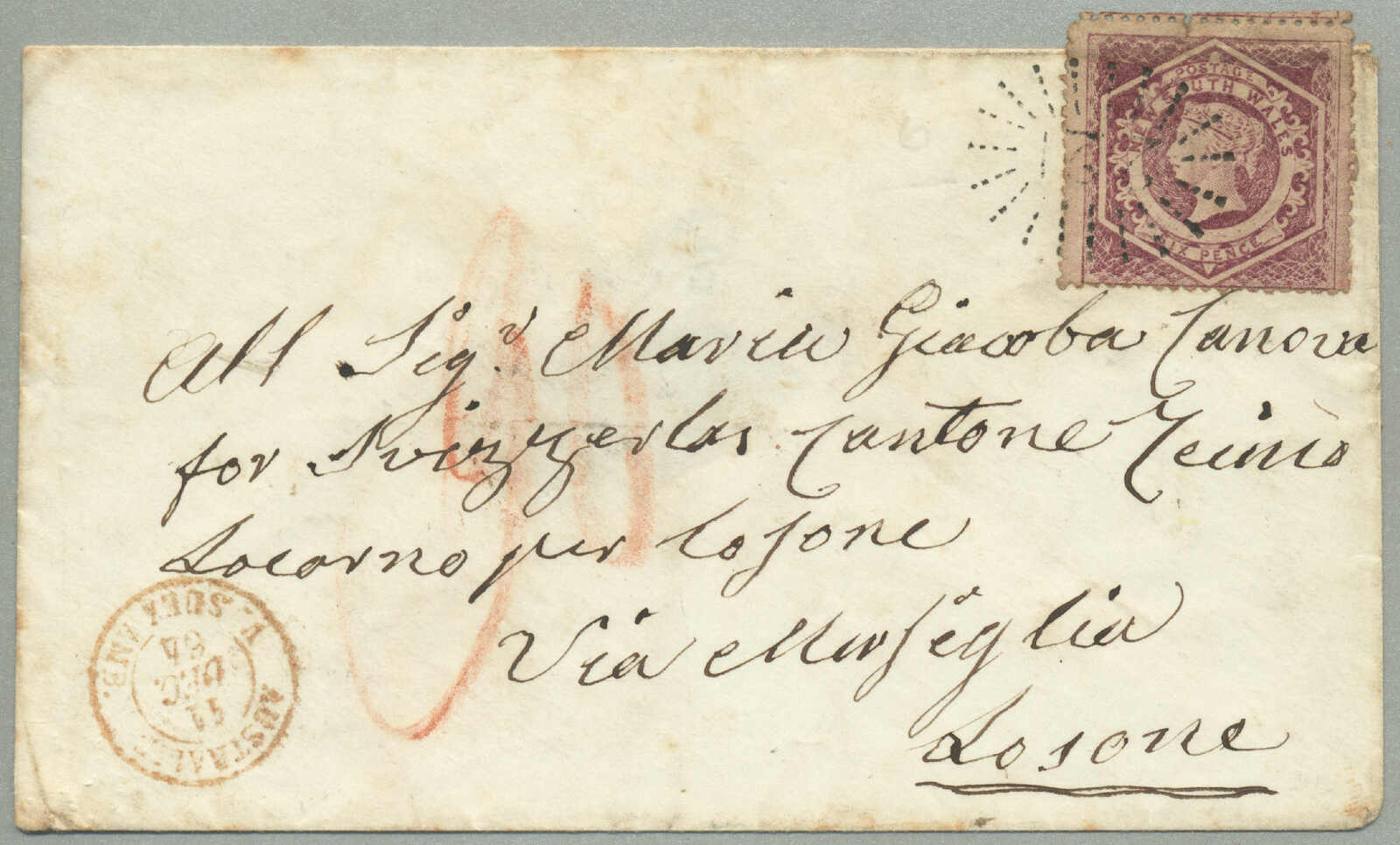 1864, Overland via Marseilles, 6 d. reddish-purple, perf. 13, small tear at top, on cover from Hunters Hill, New South Wales to Locarno, Switzerland, cancelled by rays numeral 221 of Hunters Hill (rated RRR in The Numeral
