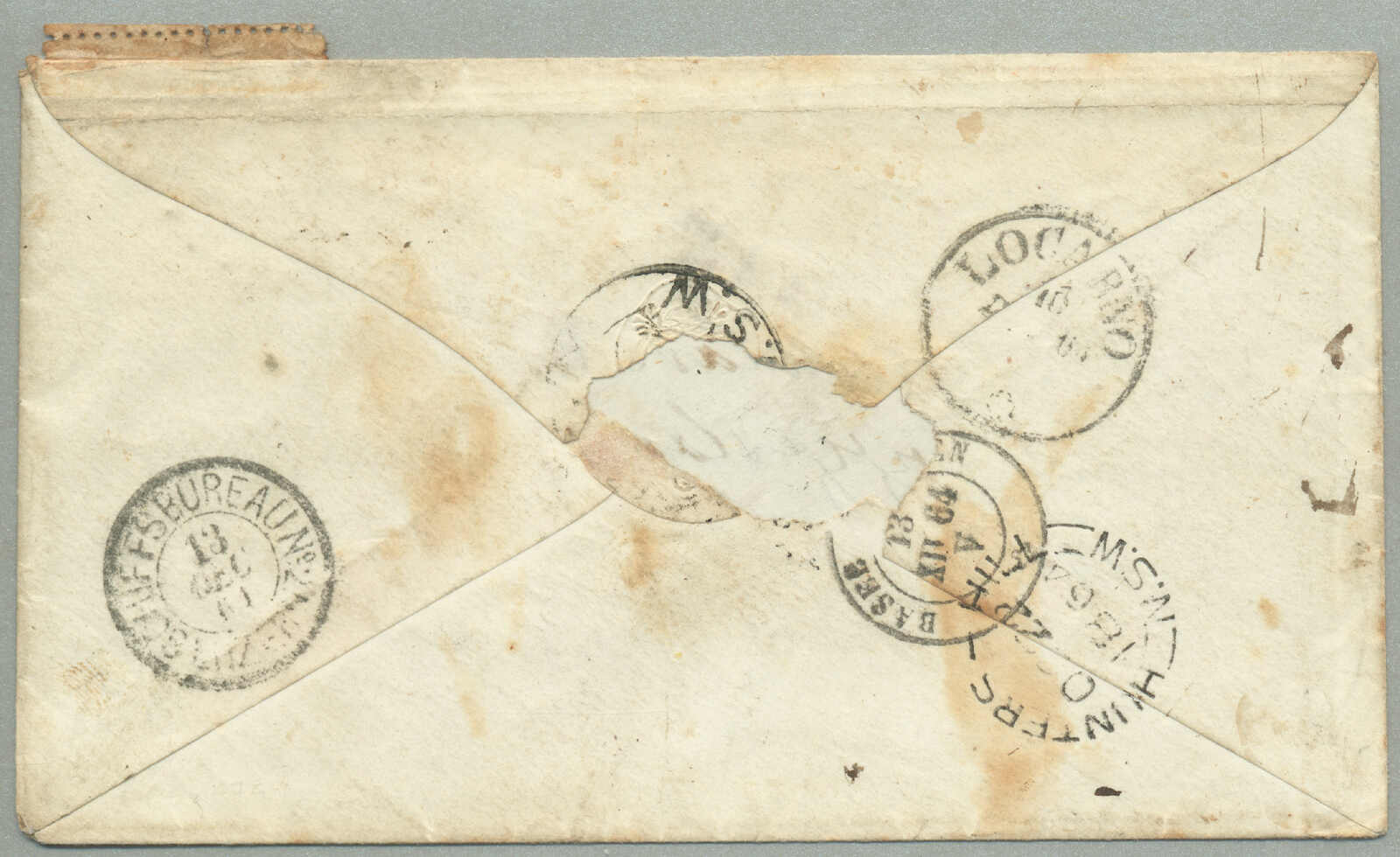 unusual, mail from New South Wales to Switzerland is very scarce, with the Swiss immigrants following the Victorian gold rushes and not venturing north over the border, a small portion of the backflap is missing and minor soiling