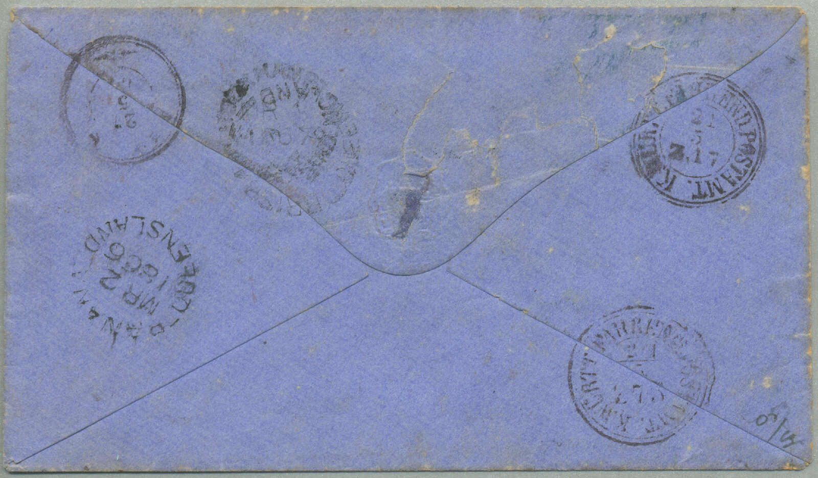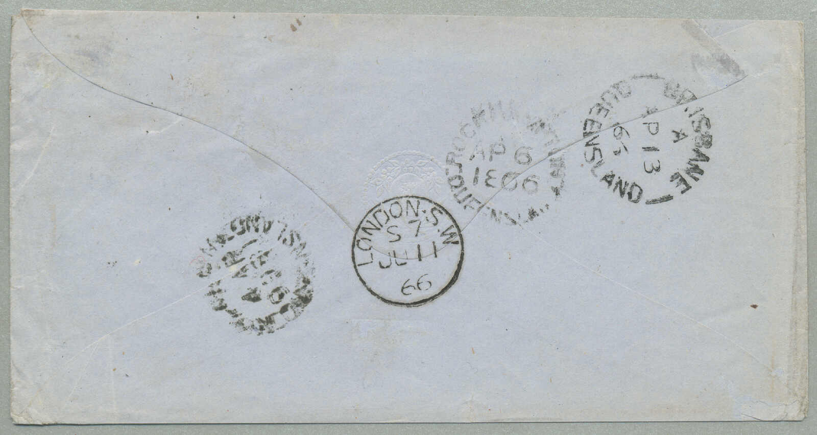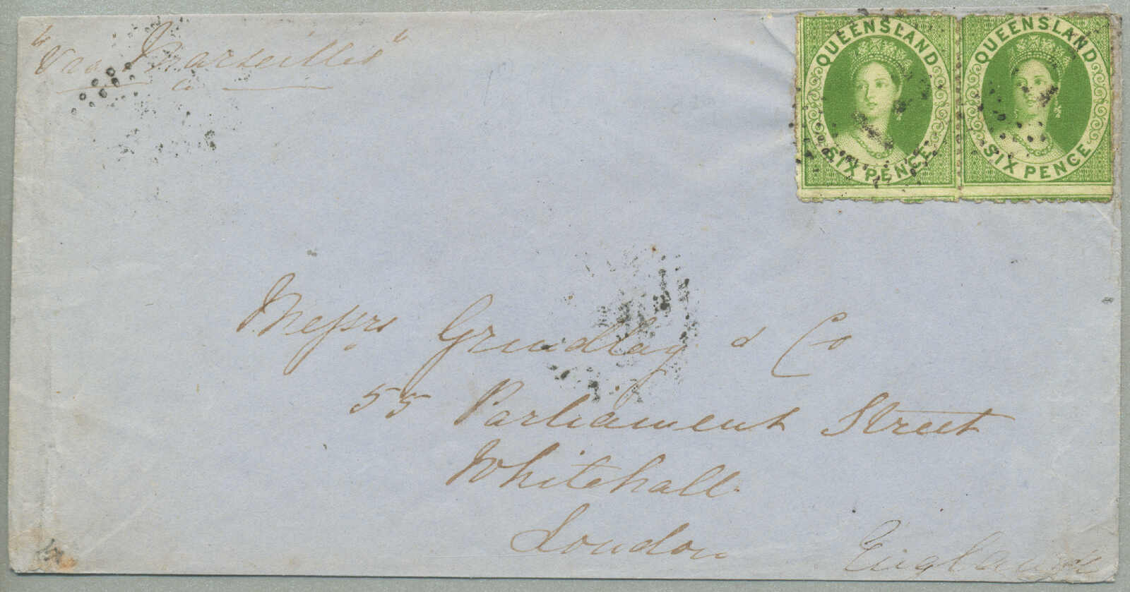 Philatelistischer Literatur, abgebildet im Vor-UPU Briefpost ab Queensland bei Ben Palmer auf Seite 143 und auf Seite 73 in Queensland Postgeschichte bei Campbell, gerade fünf Vor-UPU Briefe sind bekannt ab Queensland an die Königreich