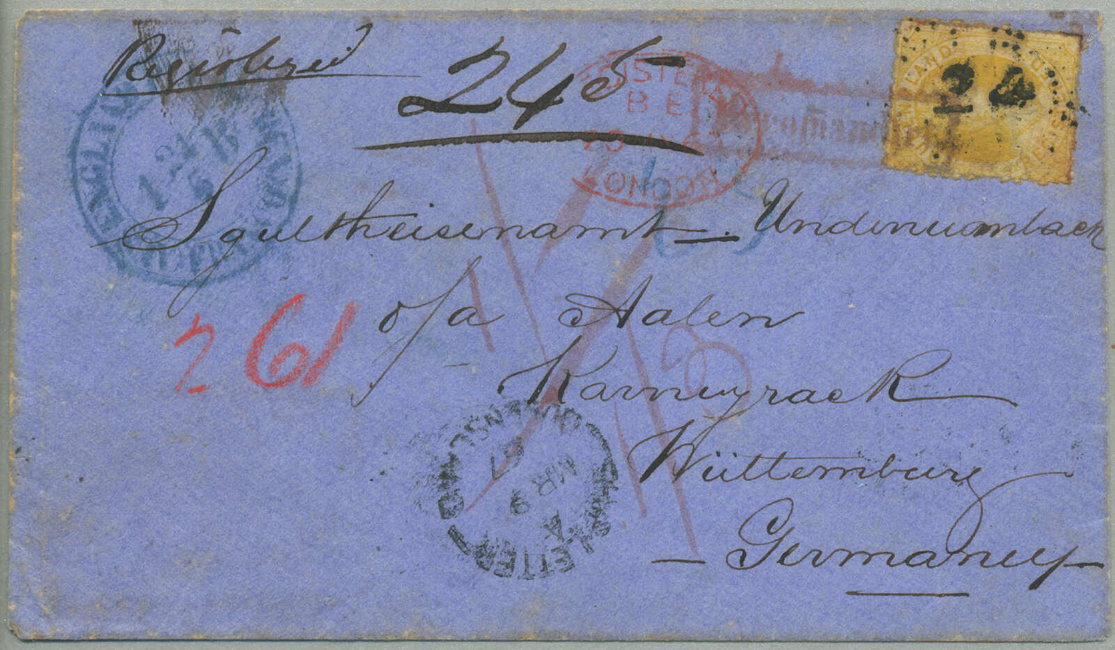 26 (Kronen) Guthaben nach Württemberg für Weiterbeförderung ein eingeschriebener Brief, zahlreiche Transit Datumsstempel auf der Vorderseite und rückseitig, trotz die fehlend Briefmarken, eine sehr attraktive und gut dokumentiert Brief in Queensland